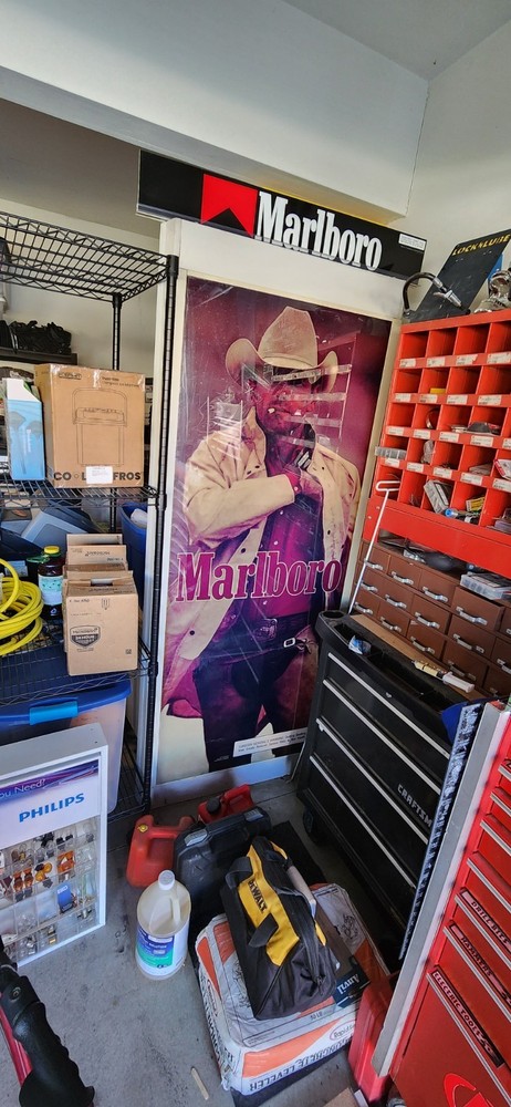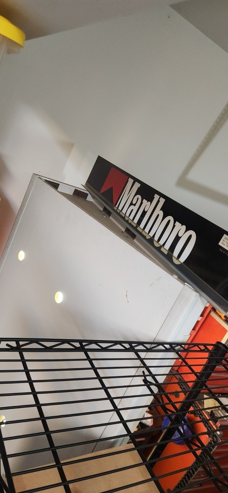 The Marlboro Light Up Sign is a collectible item that showcases the iconic Marlboro brand. This sign features a bright and visible display, making it a perfect addition to any tobacco or cigarette enthusiast's collection. Whether for display or functionality, this sign is sure to bring a touch of nostalgia and style to any space. Sign is 80"×33"×12 in a wedge shape. Sign is almost 7ft tall This was an exclusive item to tobacco stores only, and was suppose to be destroyed when big tobacco got sued the 90 something billion dollars. Rare item and haven't seen another. Will help in shipping if needed out of state just not sure how to.