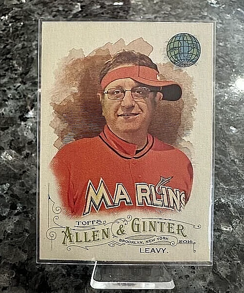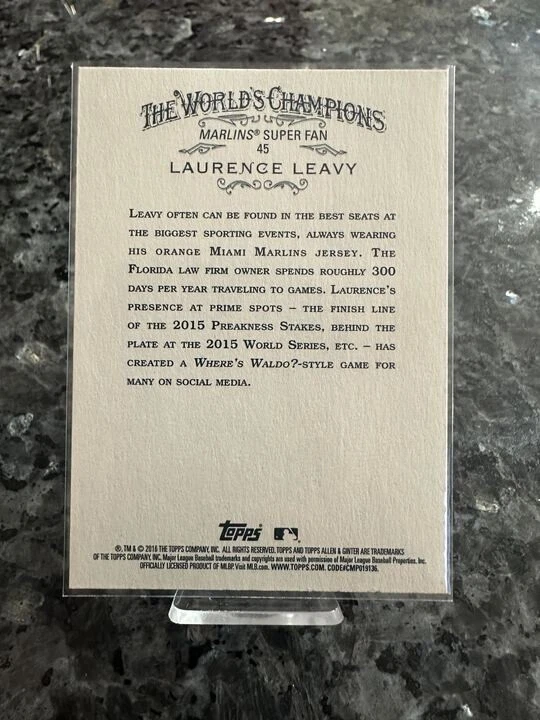 For sale is a 2016 Allen & Ginter #45 Laurence Leavy , better known as “Marlins Man” , a celebrity in the world of sports fandom. Laurence Leavy is famous for attending high-profile sporting events, often sitting in prime seats while wearing his signature bright orange Miami Marlins jersey, making him a recognizable figure at games across the country. Key Features: Person: Laurence Leavy ("Marlins Man") Set: 2016 Topps Allen & Ginter Card Number: #45 Celebrity Status : Known for his frequent appearances at major sporting events, "Marlins Man" has become a pop culture figure, beloved by fans for his enthusiasm and dedication. Whether you’re a fan of sports or a collector of unique Allen & Ginter cards, this card is a fun addition to any collection.