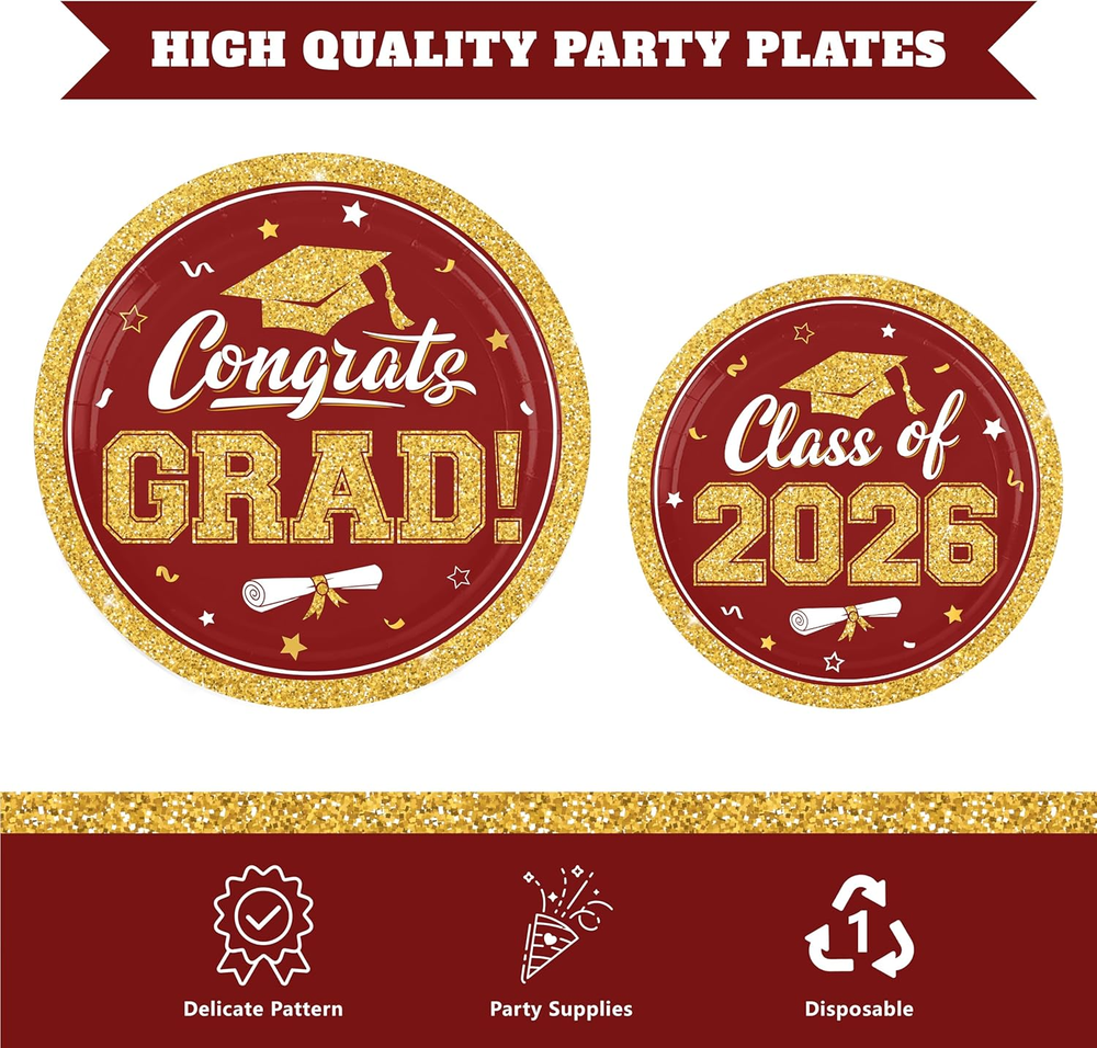 Store New Arrivals Add to Favorite View Feedback Contact Fast deliveries to the customer's home Quality customer service John Make the customers happy! Maroon Gold Graduation Decorations 2026,200Pcs Maroon Graduation Plates and Napkins,Forks,Congrats Grad Plates for Class of 2026 Graduation Party Supplies,Serve 50 Description MAROON GOLD GRADUATION PARTY SUPPLIES:You will receive 200pcs graduation tableware set includes 50pcs 9inch maroon gold congrats grad plates,50pcs 7inch class of 2026 plates,50pcs graduation napkins,50pcs forks, each can serve 50 people.Graduation decorations purple and gold leave unforgettable moments for the class of 2026, teachers, family, and friends 2026 GRADUATION DESIGN: Our maroon and gold graduation plates and napkins feature classic graduation elements, with the eye-catching text "Congrats GRAD" and "Class of 2026", combined with graduation caps, graduation certificates, and stars, to create a joyful atmosphere for the graduation party PREMIUM MATERIAL GRADUATION TABLEWARE: Our 2026 graduation plates and napkins are made of food - grade materials,, non-toxic, odorless,safe to use. Thickened graduation party plates can withstand normal food weight,which is very suitable for party food and dessert,the patterns and colors are beautifully printed,our a great choice for graduation party decorations SAVE TIME:No wash-up! the disposable maroon gold graduation plates and napkins can save you from the hassle of cleaning , you just need to red congrats grad plates and napkins party supplies into the trash can after the party, and enjoy more time with friends and family at this graduation party WIDE APPLICATION:Our graduation class of 2026 tableware is suitable for indoor or outdoor party, is widely used in high school graduation decorations, kindergartens, primary schools, middle schools, universities, nursing schools, and doctoral celebrations.Graduation paper plates and napkins also be used in conjunction with other graduation supplies to leave a lasting impression on your 2026 graduation party Product description Maroon Gold Graduation Decorations 2026 Color Maroon Gold Pattern Letter Print Material Paper Material Type Paper Occasion Party Collection Name Graduation Is the item dishwasher safe? No Product Care Instructions Disposable, no care instructions necessary Included Components Fork, Napkin, Plate ABOUT US We offer the best prices around on high quality products. Our E-store includes media such as books, movies, music and games while offering electronics, toys, sporting apparel, clothing, tools, general home, garden items and more. SHIPPING We are always working hard to ensure your package arrives as soon as possible. Please understand that some factors like weather, high postal traffic, and the performance of shipping companies are outside of our control. We offer free shipping to the lower 48 states and ship within 2 business days of payment, usually sooner. We do not accept P.O. Boxes. Please provide a physical address. For shipping outside of the continental USA, we only use eBay's Global Shipping Program. The item is shipped to KY and then sent to the rest of the world. International customers are responsible for all duties and taxes. Continue to 'check out' to calculate costs for shipping the item to your country. Messages regarding eBay's Global Shipping Program MUST be directed at eBay EXCLUSIVELY. RETURNS We offer a 30-Day Return Policy on items in which you are not completely satisfied with. You have the option of a full-refund or an exchange of the item. No returns are available on items shipped outside of the USA PAYMENT We accept PayPal. CONTACT US This page content is yet to come Please ad us to your favorite seller and visit again later Thank You CUSTOMER SATISFACTION We try our very best to make sure every customer is completely satisfied. If there's a problem, message us! We're happy to help. WE ACCEPT