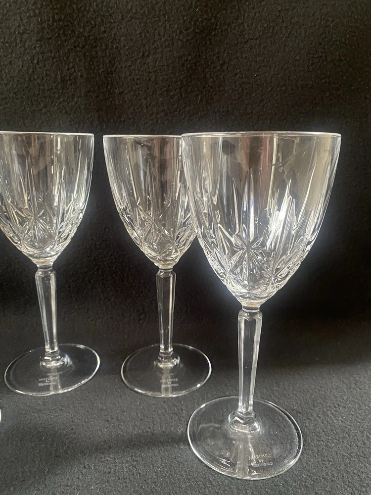 Elevate your drinking experience with these exquisite Marquis by Waterford crystal wine goblets. The set of four round goblets are hand blown in Italy and feature a stunning sparkle pattern, adding a touch of elegance to any occasion. Each goblet stands at 8 inches tall and is signed by the renowned Marquis by Waterford brand. Crafted with the finest materials and production techniques, these goblets are a must-have for any mid-century modern enthusiast. They are perfect for all occasions, whether it be a romantic dinner or a festive party. With an etched backstamp and original design, these goblets are a unique addition to any drinkware collection.