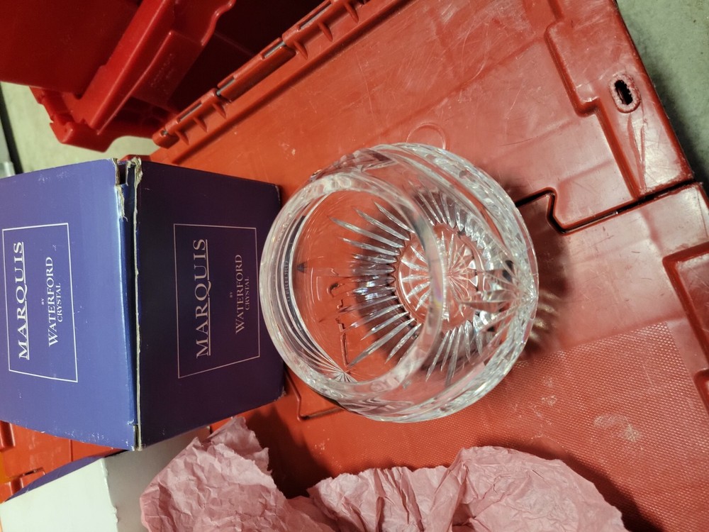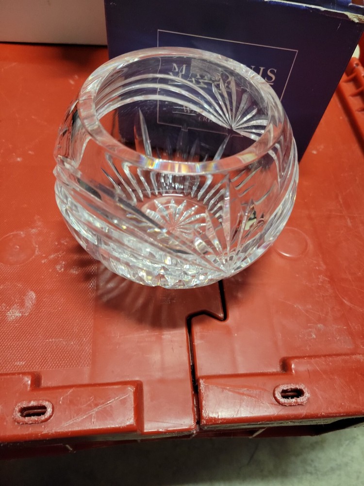This is a Marquis by Waterford crystal vase featuring a rose bowl shape with a globe design. Measuring 5.5 inches in height and 5 inches in diameter, this medium-sized vase is made of glossy crystal with intricate crystal detailing. The vase is adorned with roses pattern, making it a beautiful and elegant decorative piece. It is an original Waterford creation, discontinued and sought after by collectors of decorative pieces.
