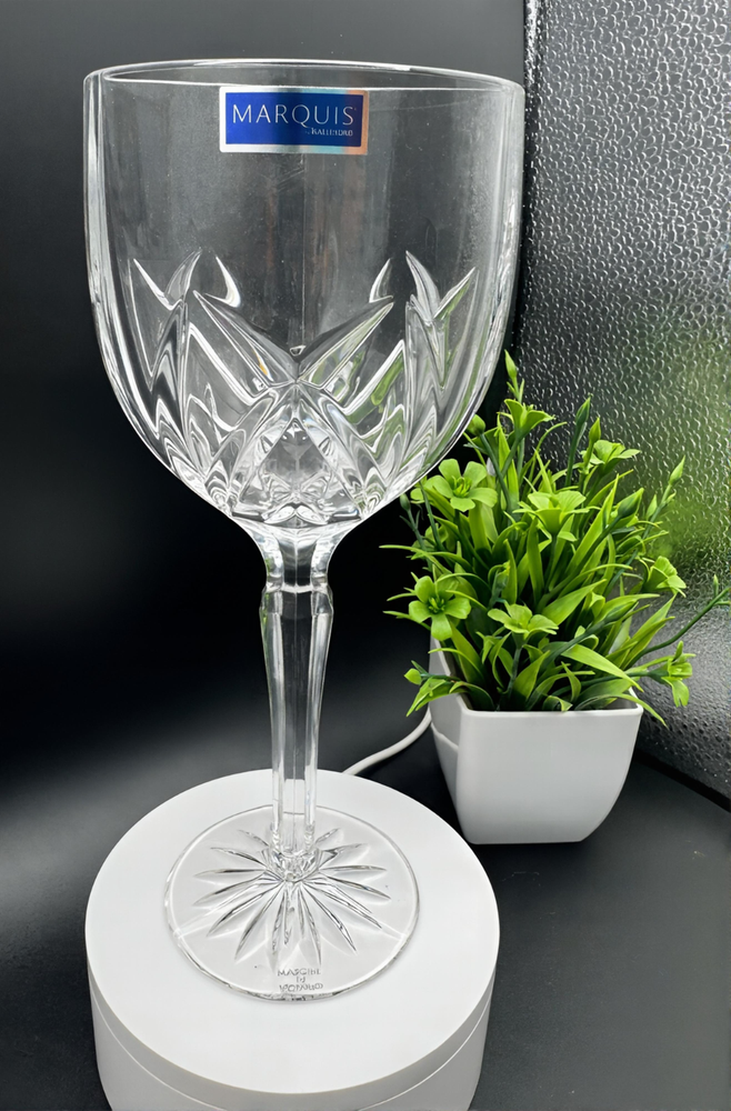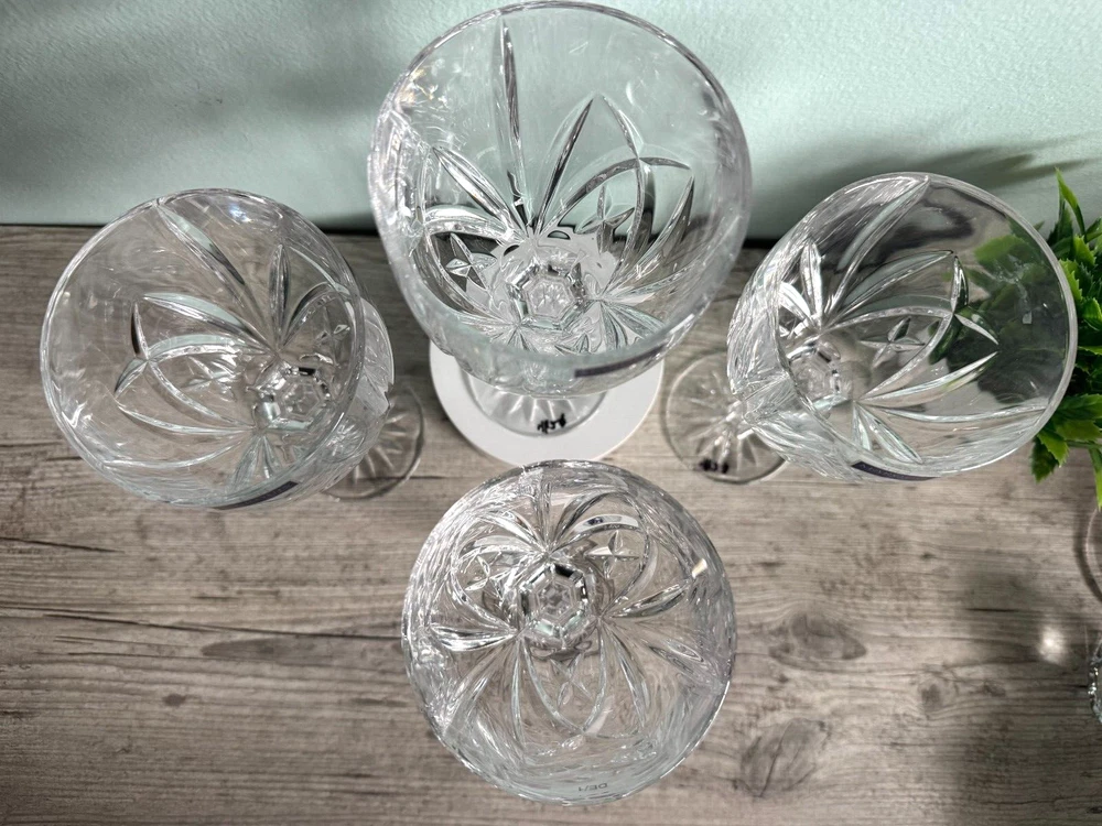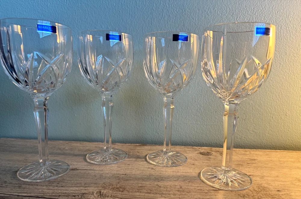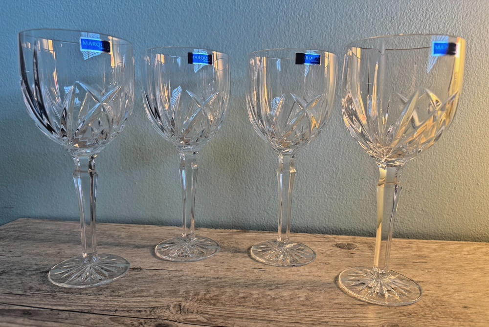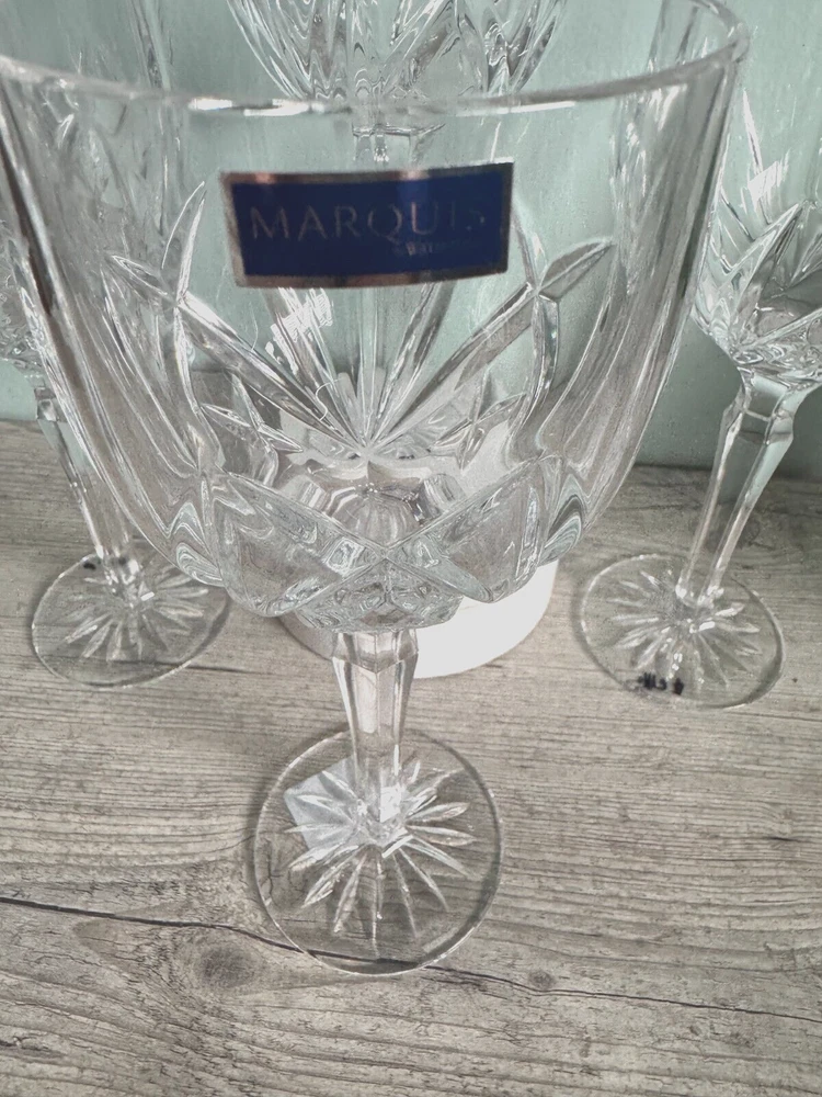 The Marquis by Waterford Omega Crystal 12 oz Wine Glasses/Goblets are a set of 4 elegant and sophisticated wine glasses perfect for serving your favorite wines. Made by the renowned brand Waterford, these clear goblets stand at 8.5 inches tall and are specifically designed for wine. Enhance your dining experience with these stunning wine glasses that will elevate the presentation of your drinks and add a touch of luxury to your table setting. Cheers to good taste with these beautiful wine goblets. Privately owned and unused- No box No chips, scratches or cracks Marquis Candle Holder is beautiful and FREE with purchase We welcome any questions or requests for additional photos Thank you for looking