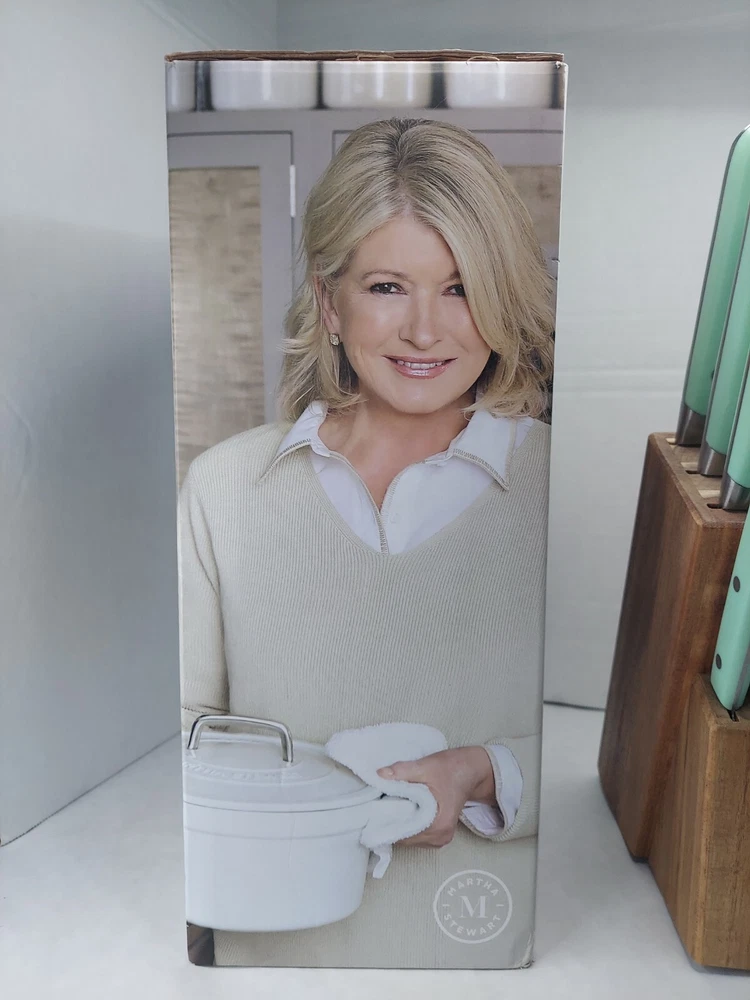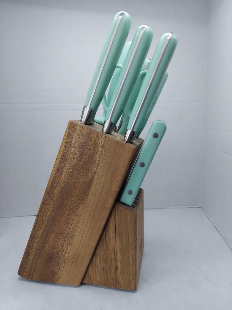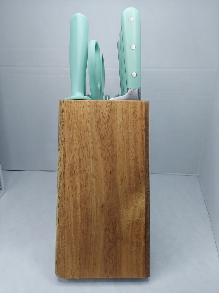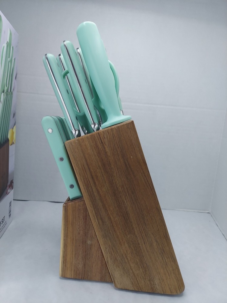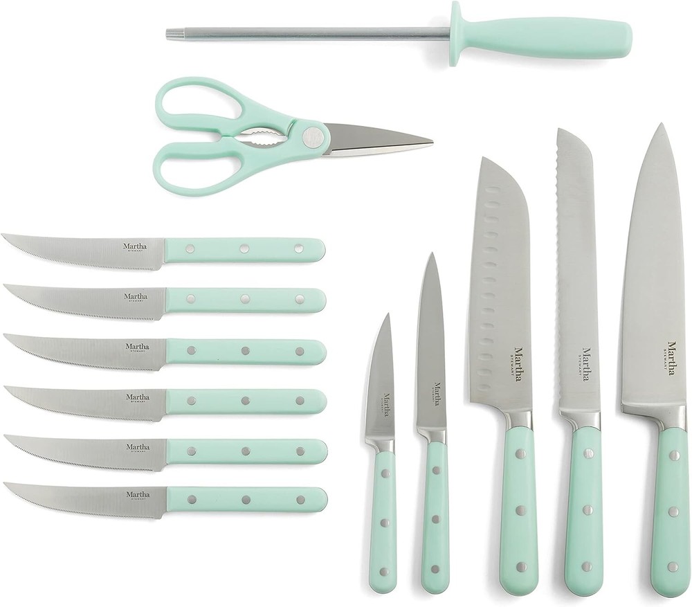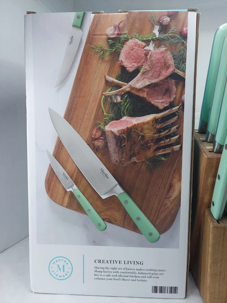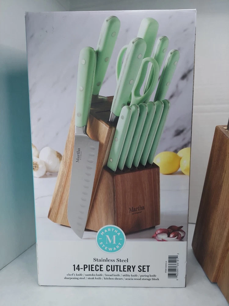 Martha Stewart Ergonomic Stainless Steel 14 Pc Wood Block Cutlery Knife Set In color "Martha Blue" WHAT'S IN THE BOX: One 8-inch chef's knife, one 7-inch santoku knife, one 8-inch bread knife, one 5-inch utility knife, one 3.5-inch paring knife, six 4.5-inch steak knives, one pair of kitchen shears, one sharpening steel, and one acacia wood block HIGH CARBON BLADES: Forged stainless steel knives with full tang construction for balance and durability ERGONOMIC HANDLES: Triple-riveted handles in Martha's signature shade of blue STURDY KNIFE BLOCK: Acacia wood knife block stores knives safely Open Box never used.
