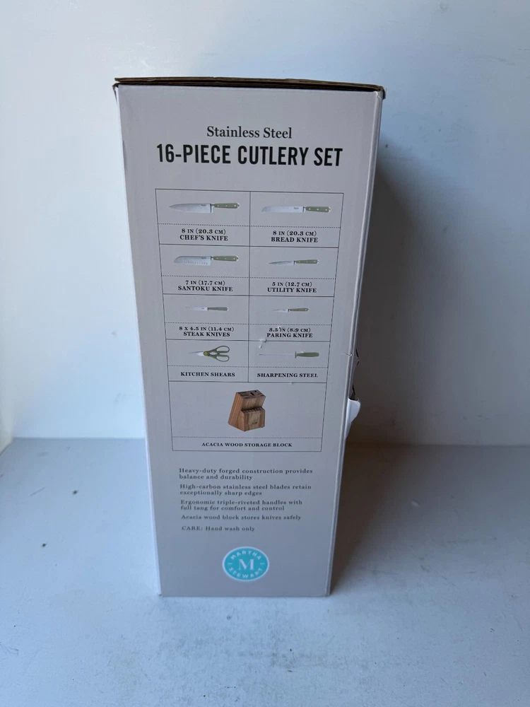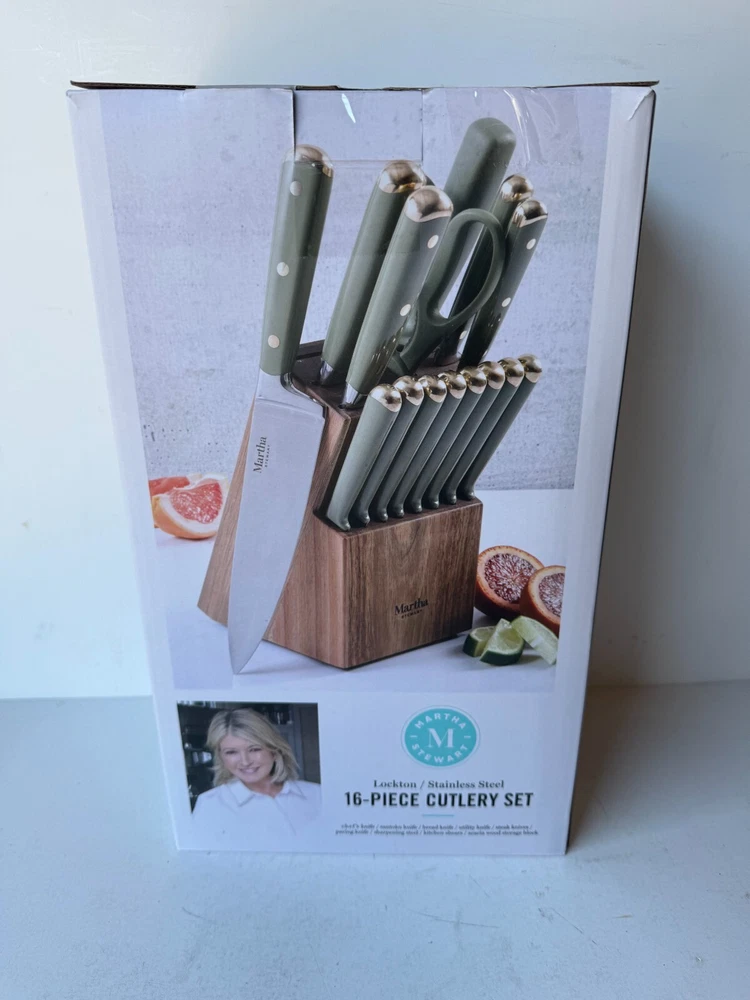 Martha Stewart Cutlery Knife Set High Carbon Stainless Steel Blade (16-Piece) Description Martha Stewart Cutlery Knife Set High Carbon Stainless Steel Blade (16-Piece). Product Detail • Brand : Martha Stewart • B;ade Material : High Carbon Stainless Steel • Blade Color : Silver • Type : Cutlery Knife Set Please message me if you have any questions.