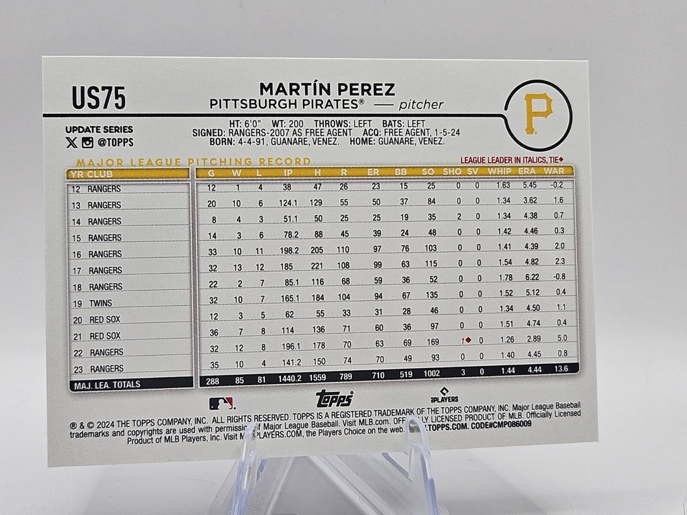 This 2024 Topps Update sports trading card features Martin Perez, also known as Martín Pérez, of the Pittsburgh Pirates. The card is part of the Silver Crackle Foilboard insert set and has a card number of US75. It was manufactured by Topps in the year 2024 and is a great addition to any baseball fan's collection. The card is not autographed and is a parallel/variety of the Silver Crackle Foilboard. The card falls under the categories of Trading Card Singles and Sports Trading Cards, and is a must-have for fans of the Pittsburgh Pirates. It is a perfect item for collectors and enthusiasts of sports memorabilia. Get your hands on this rare and valuable card today!