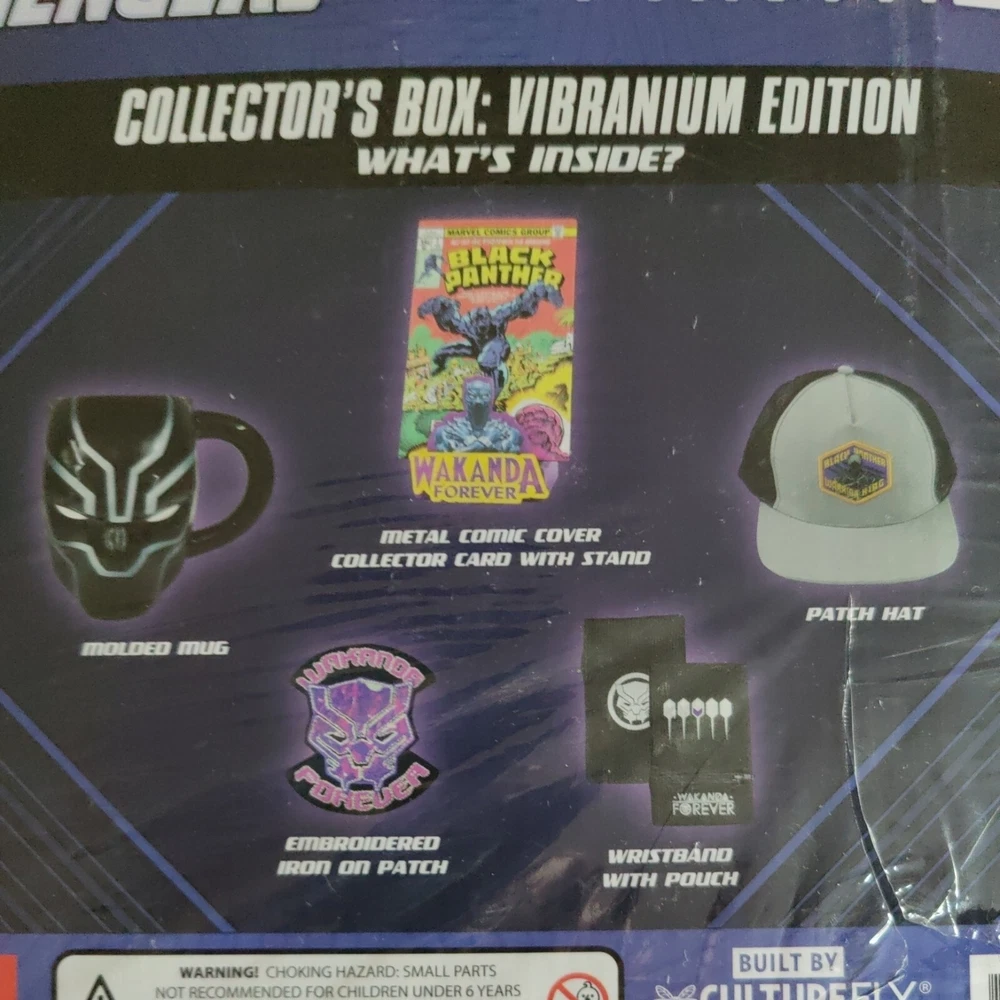 This limited edition Marvel Avengers Black Panther Collector's Box is a must-have for any fan of the franchise. The Vibranium Edition includes 5 items that are perfect for display or use. The box features the iconic character Black Panther and is branded with the Culture Fly logo. The box is made in China and includes items that are not signed. It is a great addition to any collection of collectibles, comic books, or merchandise. Get your hands on this amazing piece of Marvel Avengers memorabilia today!