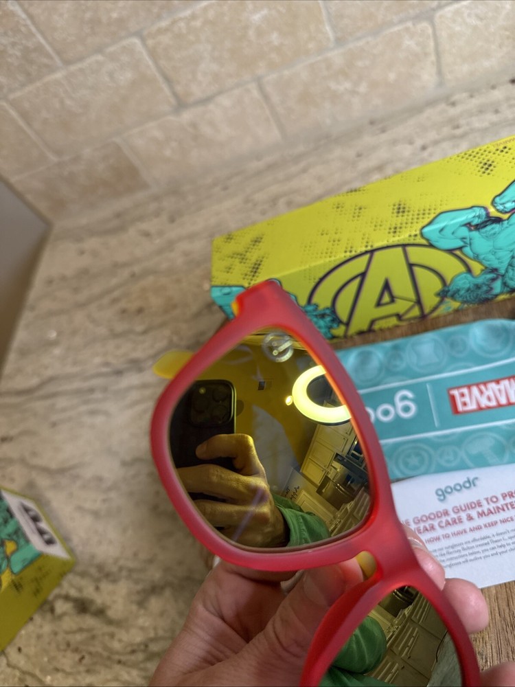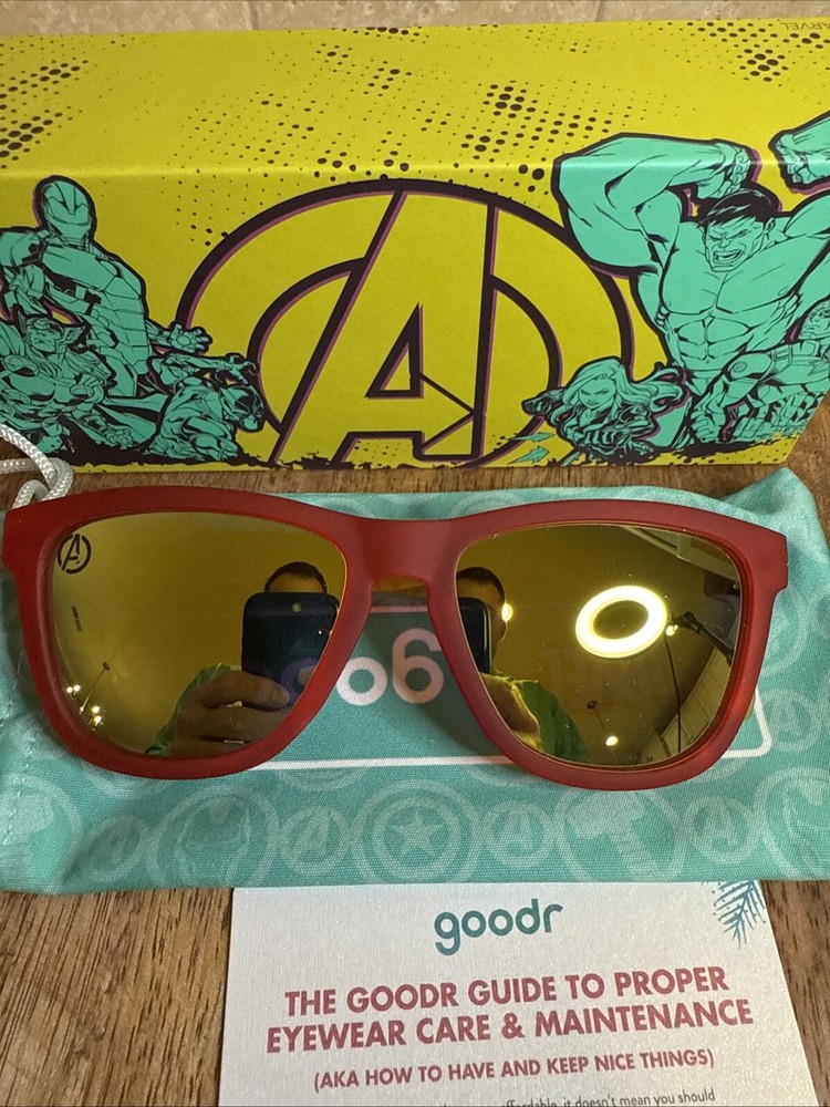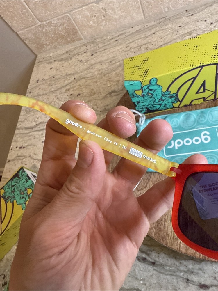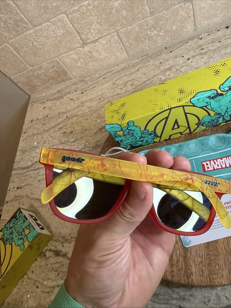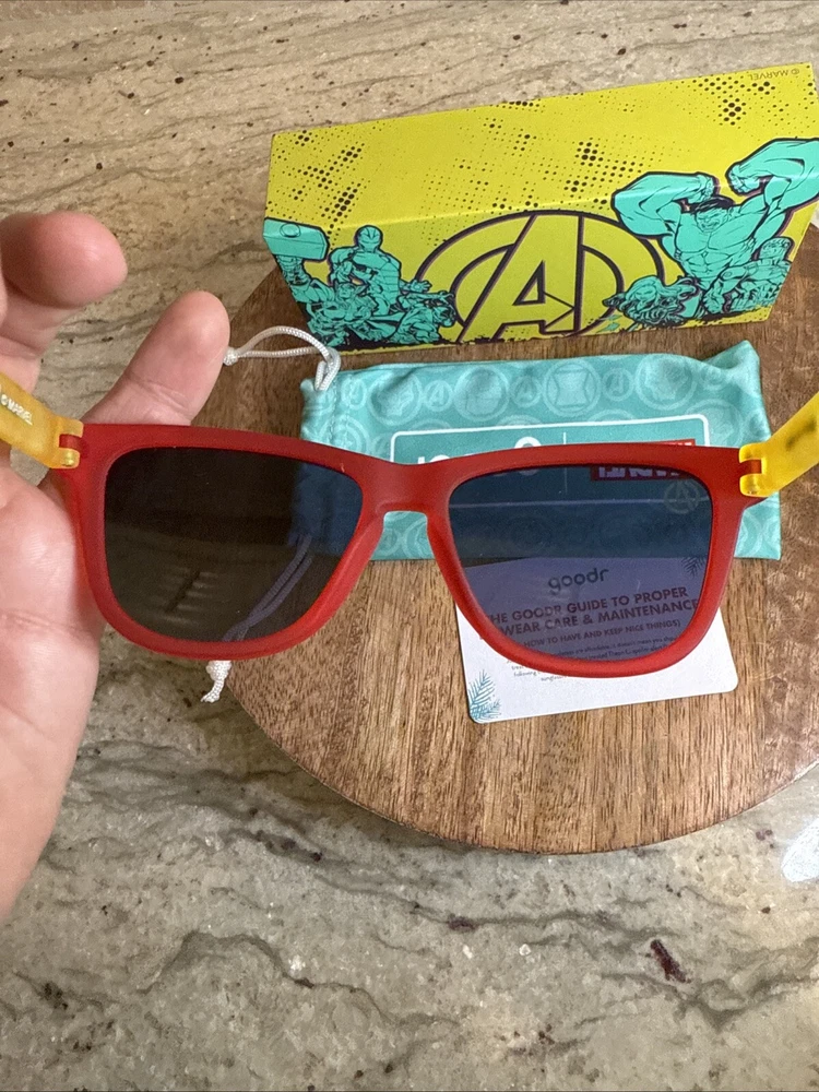 Elevate your running game with these Marvel Avengers Goodr “J.A.R.V.I.S. Vision” polarized running sunglasses. The red frame and gold lenses add a touch of style to any workout outfit. Designed for men, these sunglasses feature polarized lens technology to reduce glare and provide clear vision during outdoor activities. The Goodr OG model is named after the popular Avengers character Vision. These sunglasses are perfect for fans of the Marvel Cinematic Universe who love to stay active and look good doing it. With a sleek and sporty design, these sunglasses are a must-have accessory for any superhero fan.