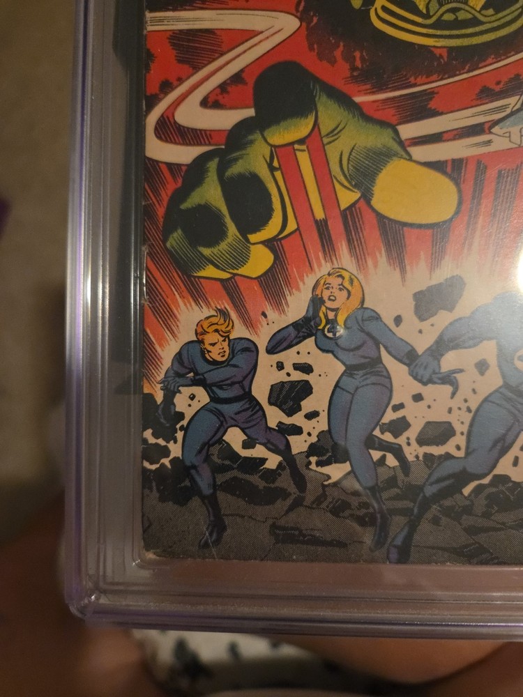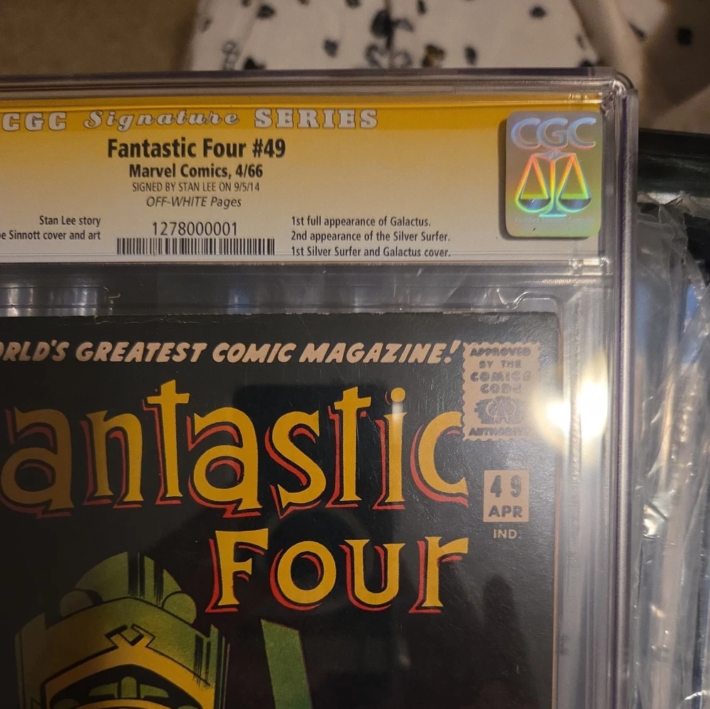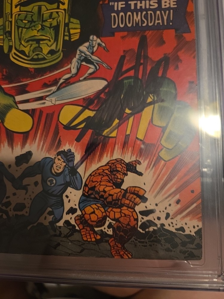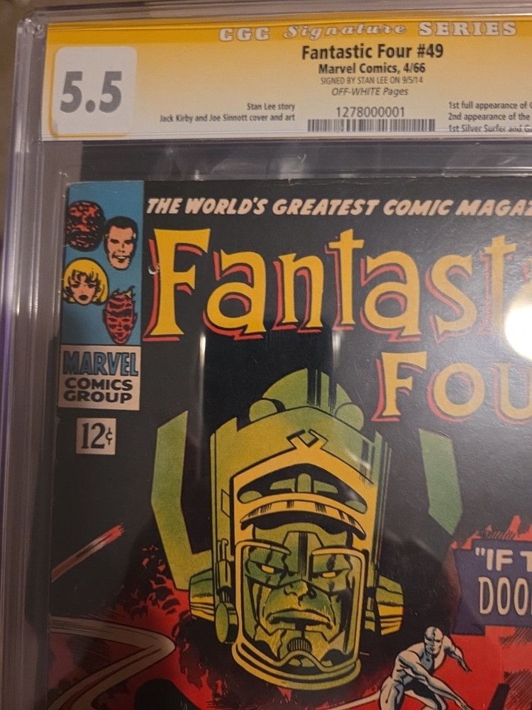 The product is a vintage Marvel Comics Fantastic Four No.49 from 1966, autographed by Stan Lee. This single issue comic book features key issues from the US Comics tradition, with artwork by Joe Sinnott and Jack Kirby. The story, titled "IF THIS BE DOOMSDAY!" showcases the superhero team Fantastic Four and the character Galactus in the Marvel Universe. Certified by Certified Guaranty Company (CGC) as a 5.5 Fine- grade, this collectible item appeals to general audiences interested in superheroes and classic comic book storytelling.