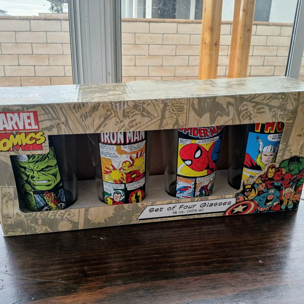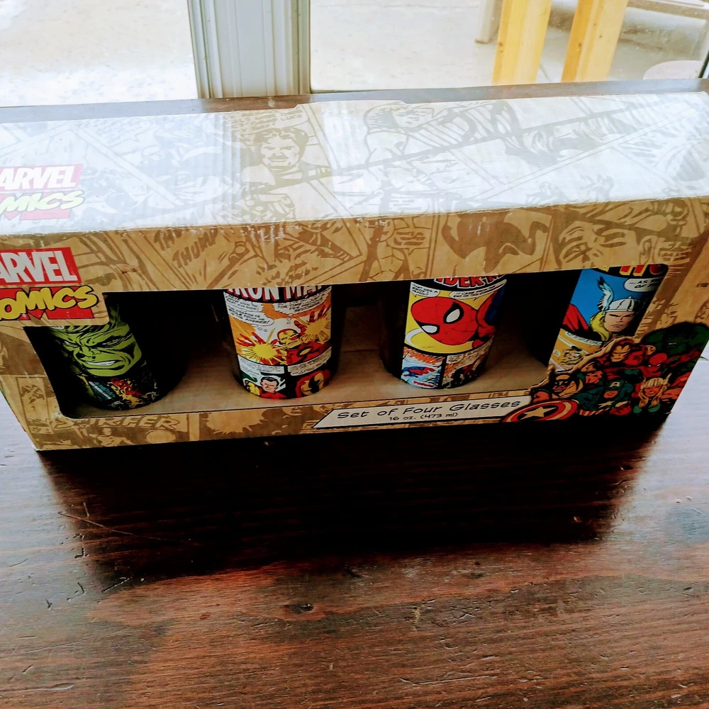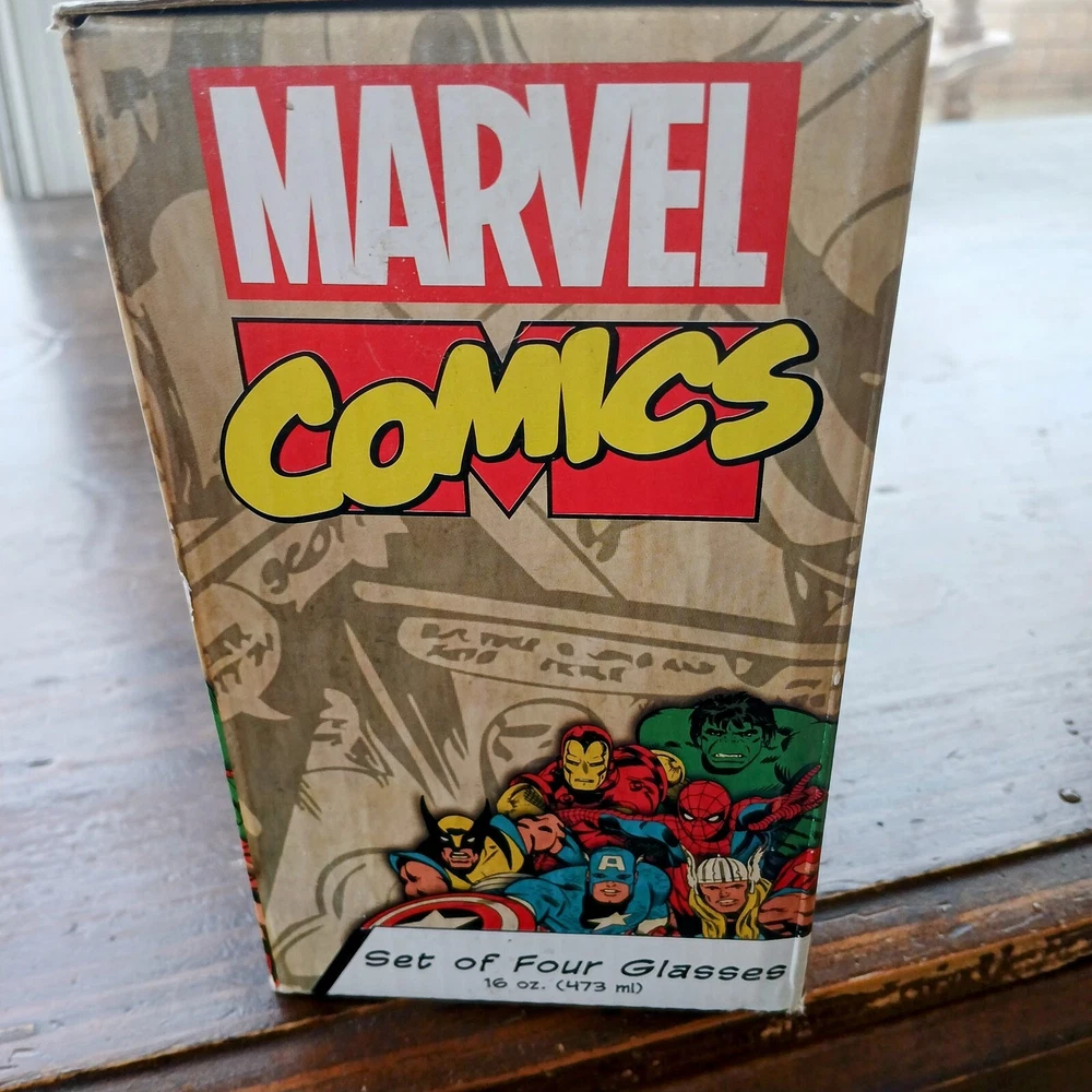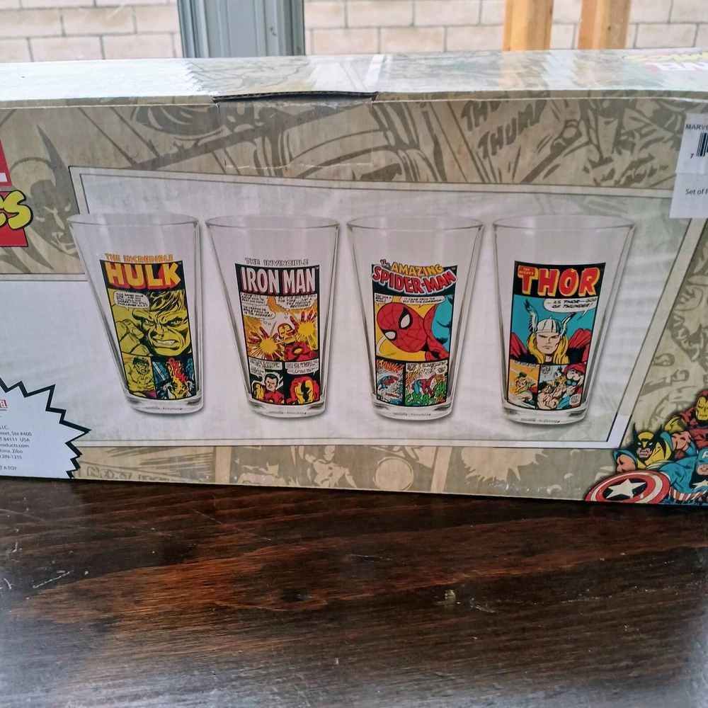 Marvel Comics Glassware Set. Each 10 oz glass features a vibrant design of Hulk, Iron Man, Thor, and Spiderman, making it the perfect addition to any fan's collection. Crafted for durability and ease of use, these glasses are suitable for everyday use or special occasions. The set comes with 4 glasses. Never been used. One side of box has crease, see photos. Very good condition.