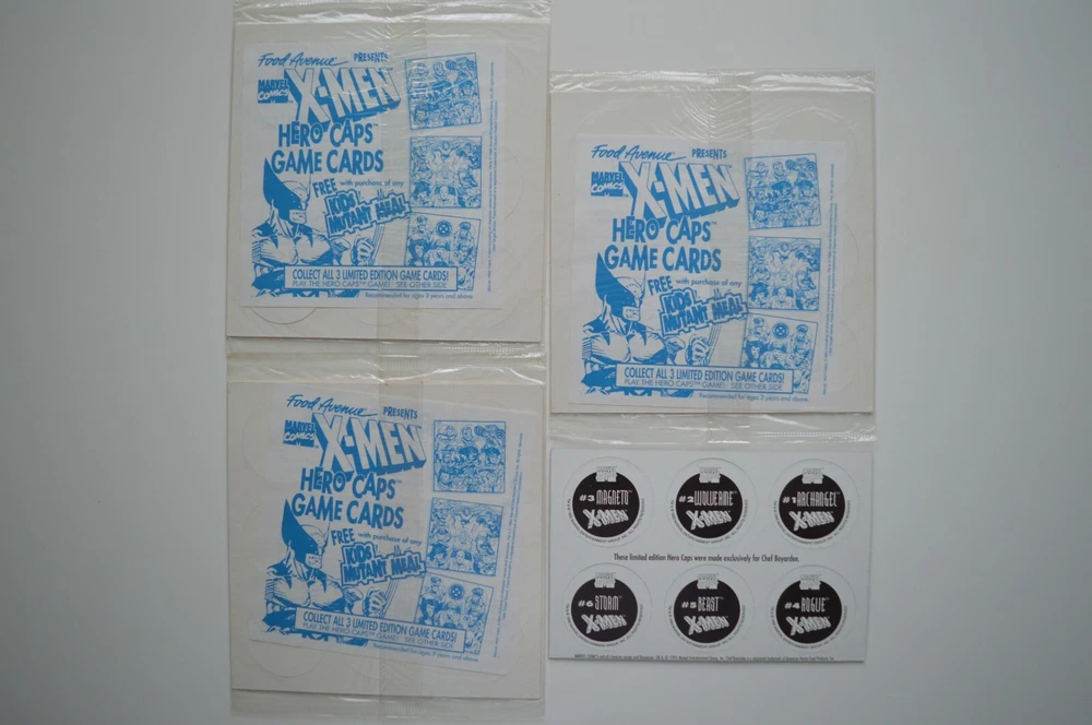 1994 Marvel Comics X-Men Food Avenue Hero Caps Complete Set 27/27 ( 3 Sheets ) + Poster From This Series . 1995 marvel Comics X-Men Chef Boyardee Hero Caps Complete Set Pogs 6/6 + Poster From This Series . Condition Used . See The Photo . Have A Nice Day And Good Luck To Everyone !