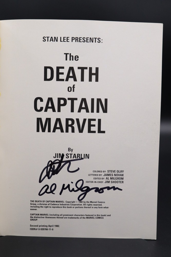 Link to our BEST items!! Link to our ENDING items!! Link to our FAQ page !! Link to our NEWEST items!! Item: Marvel Graphic Novel (1982) #1 2nd Print Death Of Captain Marvel Signed Starlin & Milgrom VF- Special Notes: This issue is a Second Printing! This issue is Signed by Jim Starling & Al Milgrom on the first page! This issue does not come with a COA, but because of our experience in selling autograph comics, we believe the autographs are authentic. We do not use stock photos! What you see in the pictures is what you will be getting. Publication Date: Apr 1982 (The date in the title refers to the year the title started) Condition: Very Fine - (7.5) white pages The graphic novel will be shipped bagged and boarded for protection. SHIPPING: All pricing is based on the weight of the package and your location. Package Weight: 2 lb[s] Package Size: 12x9x4 We charge exact shipping costs per USPS with NO handling charge. You can check our shipping quotes on the USPS website. For the convenience of the winner, we offer shipment via Priority Mail or Media Mail, when shipping to an address inside the USA. For International Winners, we offer Priority Mail International or First-Class International Mail. Please click on the "SHIPMENTS and PAYMENTS" tab above for more details. * FREE Insurance, for items totaling under $100.00, is only available when shipping with USPS Priority to an address within in the USA! All packages will have a tracking number sent to the winner! Shipping & Payment Terms: If you would like to have your item insured, please contact us and we will send you an invoice with the adjusted shipping charges. We will be happy to combine the shipping charge for multiple auction wins . If you win a single item, you do not have to wait for an invoice to make your payment. IF YOU WIN MULTIPLE AUCTIONS, PLEASE WAIT UNTIL WE SEND YOU A COMBINED INVOICE BEFORE PAYING FOR YOUR ITEMS. Please DO NOT pay for items separately. We will ship your items within 2 business days upon receiving your payment. Payment Options: PayPal is the preferred method of payment per eBay's policies. If you do not have a PayPal account, we do accept credit card payments over the phone. Payment MUST be received within 7 business days of the auction ending or your bid will be cancelled and eBay will be contacted. Questions: We will be happy to answer any questions you have about our items before the auction ends. Please ask your questions as early as possible so we have plenty of time to answer them. Return Policy: All returns MUST be approved by Duncanville Bookstore. If there is a problem with your order, please give us a chance to address the issue before you leave negative feedback and/or contact PayPal for a refund. Store Info: Please check our other auctions and our eBay store for more great deals!! Check out our info page for more great ways to get in touch with us. Also, feel free to contact us if you are looking for anything in particular or you are looking to sell your items. We are always buying!! Duncanville Bookstore is open 7 Days a Week 10am-7pm CST!!