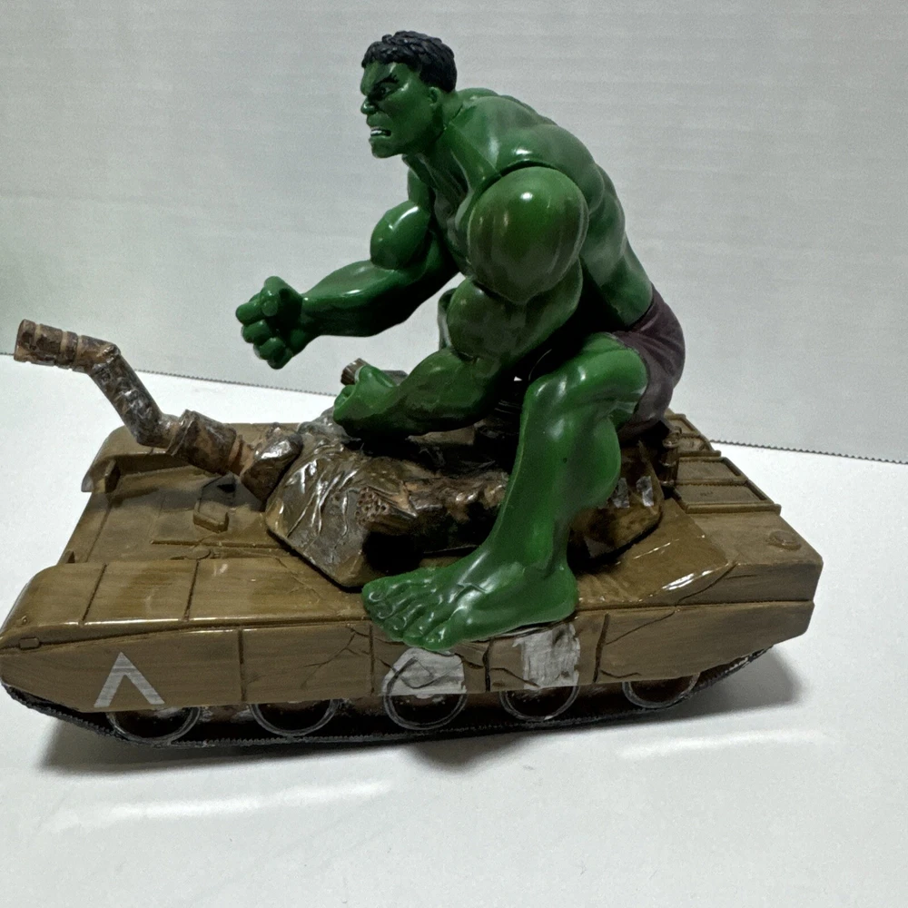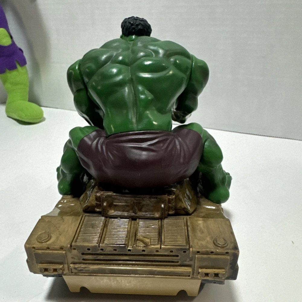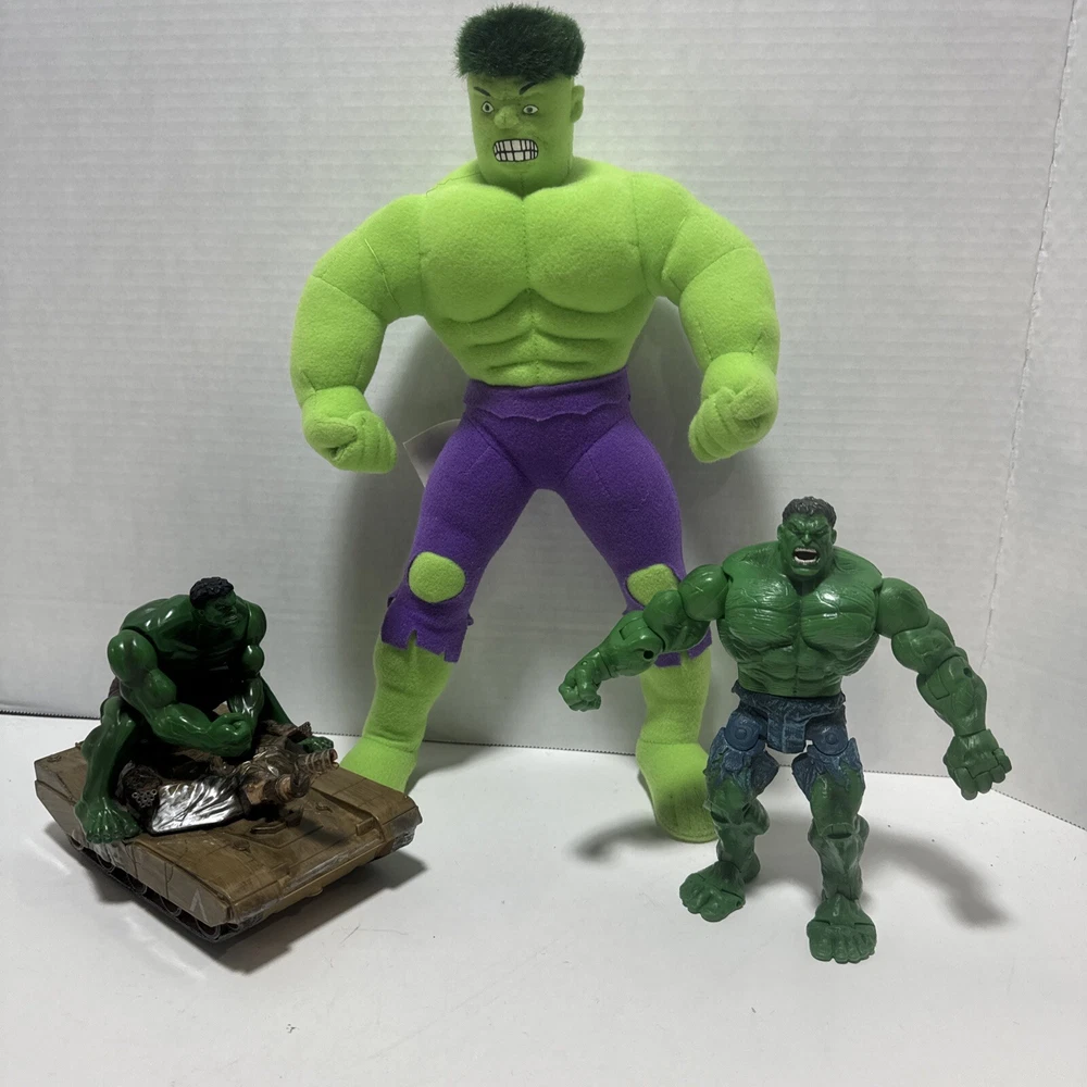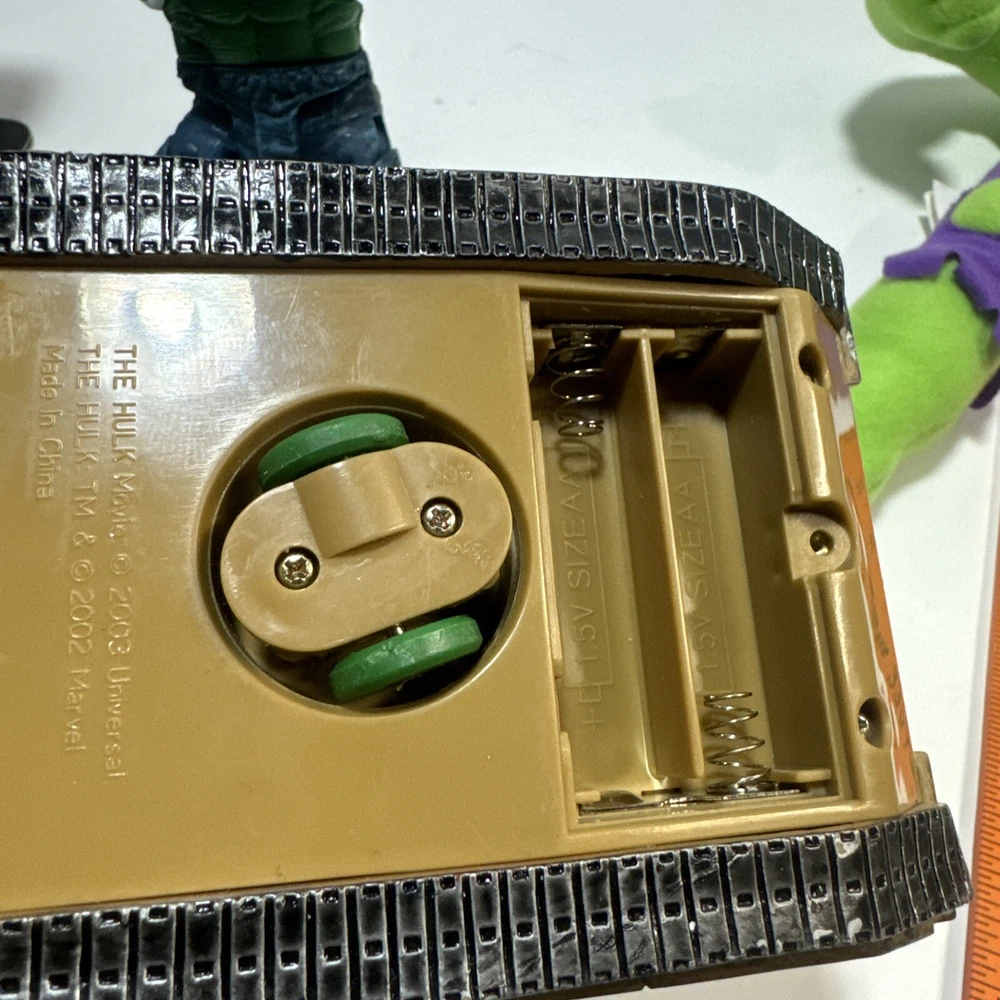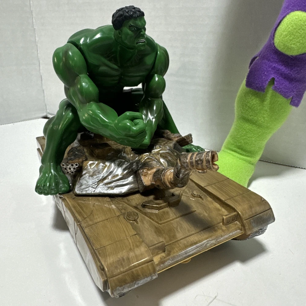 Marvel Incredible Hulk 2003 Action And Plush Figures With Tank. Lot Of 3 Items. The 14" plush hulk for ages 3 and above. The Hulk w/tank uses 2 AA batteries and compartment is clean. Sounds like a tank moving and slightly begins to spin. The 7 inch posable hulk is made with great detail. Lots of moving joints and stands alone. This lot of 3 hulk items is a great addition to a Marvel collection of any kind.