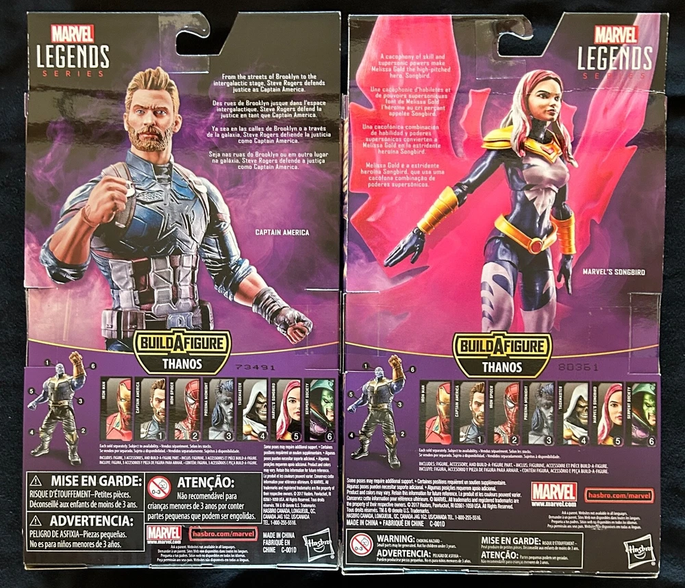 You are bidding on a brand new, sealed Marvel Legends Series lot of two 6" figures: Avengers Infinity War Captain America and Songbird with BAF Thanos (**Please note, this is not a complete set for the BAF). Packaging has some mild shelf wear, including cardboard creasing and cuts on top, edge dings, and bubble scuffing, and would NOT be considered mint condition (please review photos .) Seals are several years old, but they are intact. These items are packaged together and ready to ship, so cannot be separated for individual sale. We have lots of other great Marvel items listed if you're interested in combined shipping. From a smoke-free, pet-free home. Please contact us with any questions prior to bidding. We strive to provide great customer service, so keep the lines of communication open. We ship to the Continental U.S., Canada, and select countries using eBay's Global Shipping Program. We will NOT ship through freight forwarders...please see below. As always, we are more than happy to combine shipping on multiple purchases in the same order, so please check out our other items for sale. Depending on the item's value, we ship using USPS Ground Advantage or Priority Mail with tracking. If you desire an alternate method of shipping, please notify us prior to paying for your item so we can properly invoice. For collectible items, you can be assured they are packaged carefully with appropriate boxes and packing material. We cannot accept returns unless the item is damaged during shipping. If this is the case, please contact us and we will work with you to make things right. Any return shipping will be the buyer's responsibility prior to issuing a refund. We reserve the right to cancel orders from bidders with less than five feedbacks, or those who have received or given more than five negative feedbacks in the past 12 months. This applies to third party sellers...see below. Absolutely NO Drop Shippers or freight forwarders. Orders shipping to a third party will be accompanied by an invoice with our company name. Requests to ship through freight forwarding companies will be cancelled, as this violates our terms of service. If it's going overseas, it's going via eBay Global Shipping…sorry, no exceptions. Thanks for shopping with us!