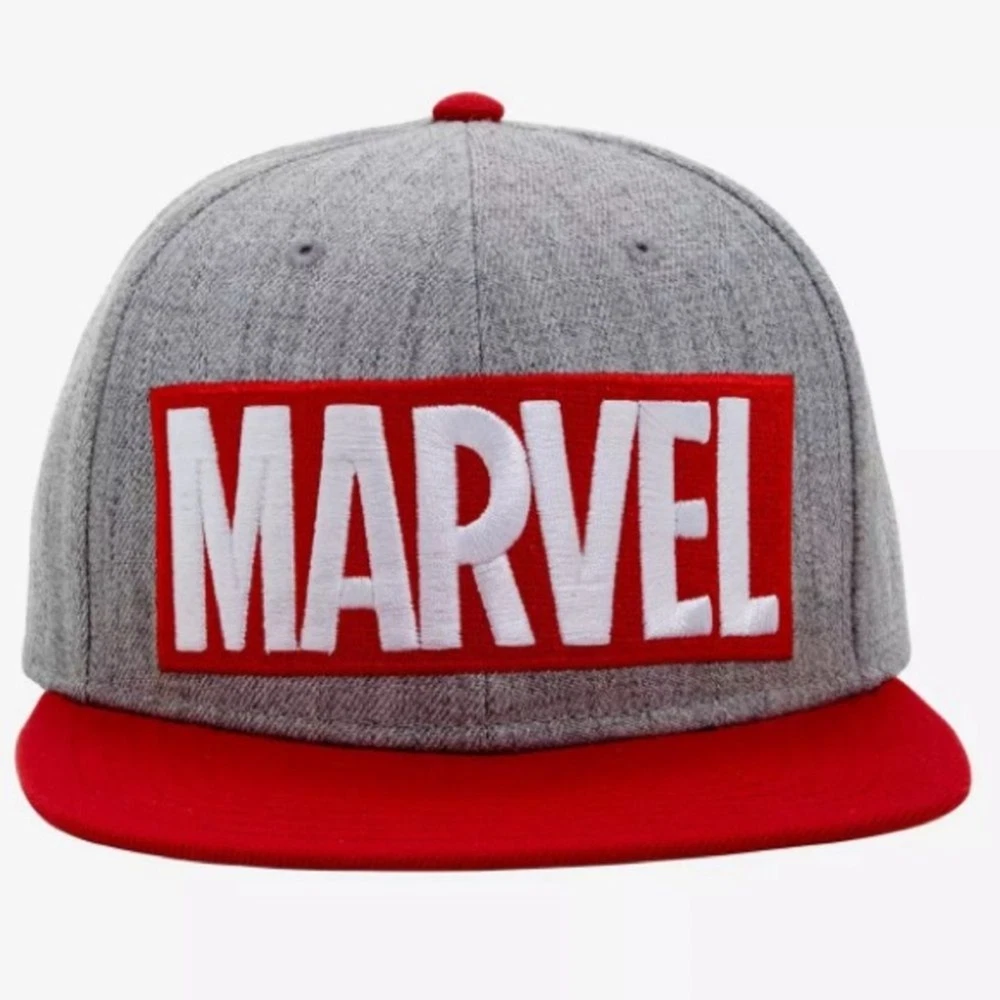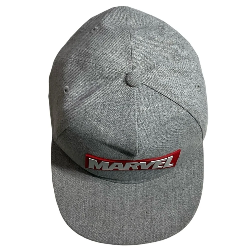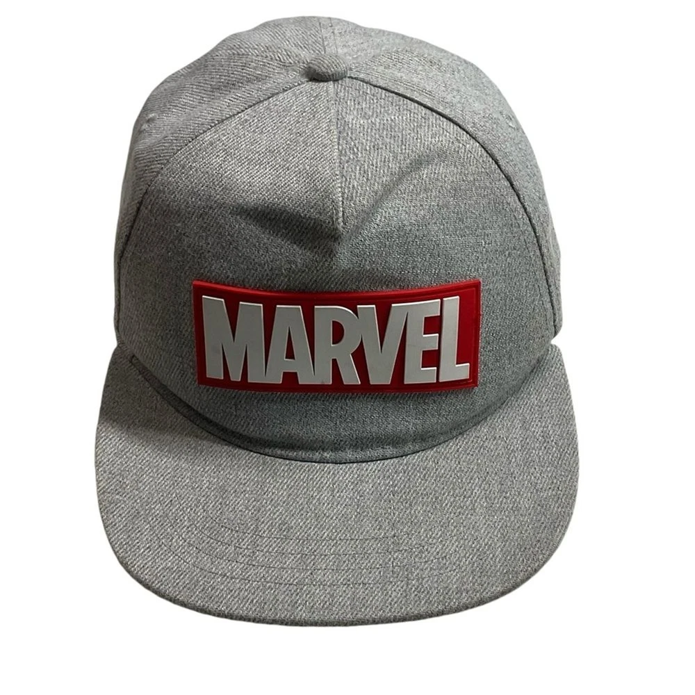 Marvel Logo Snapback Gray Red Truckers Hat Features: Superhero symbols under visor One size fits most Crown: 85% acrylic, 15% wool Upper visor: 100% polyester Under visor: 100% cotton Great pre-owned condition: no holes, rips, tears or stains.