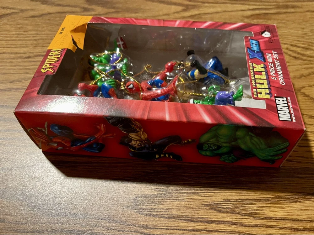 Add some superhero flair to your holiday decor with this 5-piece mini ornament set featuring Marvel's Spiderman, The Incredible Hulk, and X-men. The ornaments are vintage and were manufactured in 2003. The set is used, vintage and comes in its original box. The multicolor ornaments are perfect for any occasion, especially Christmas. The set is a must-have for any Marvel collector and is sure to impress.