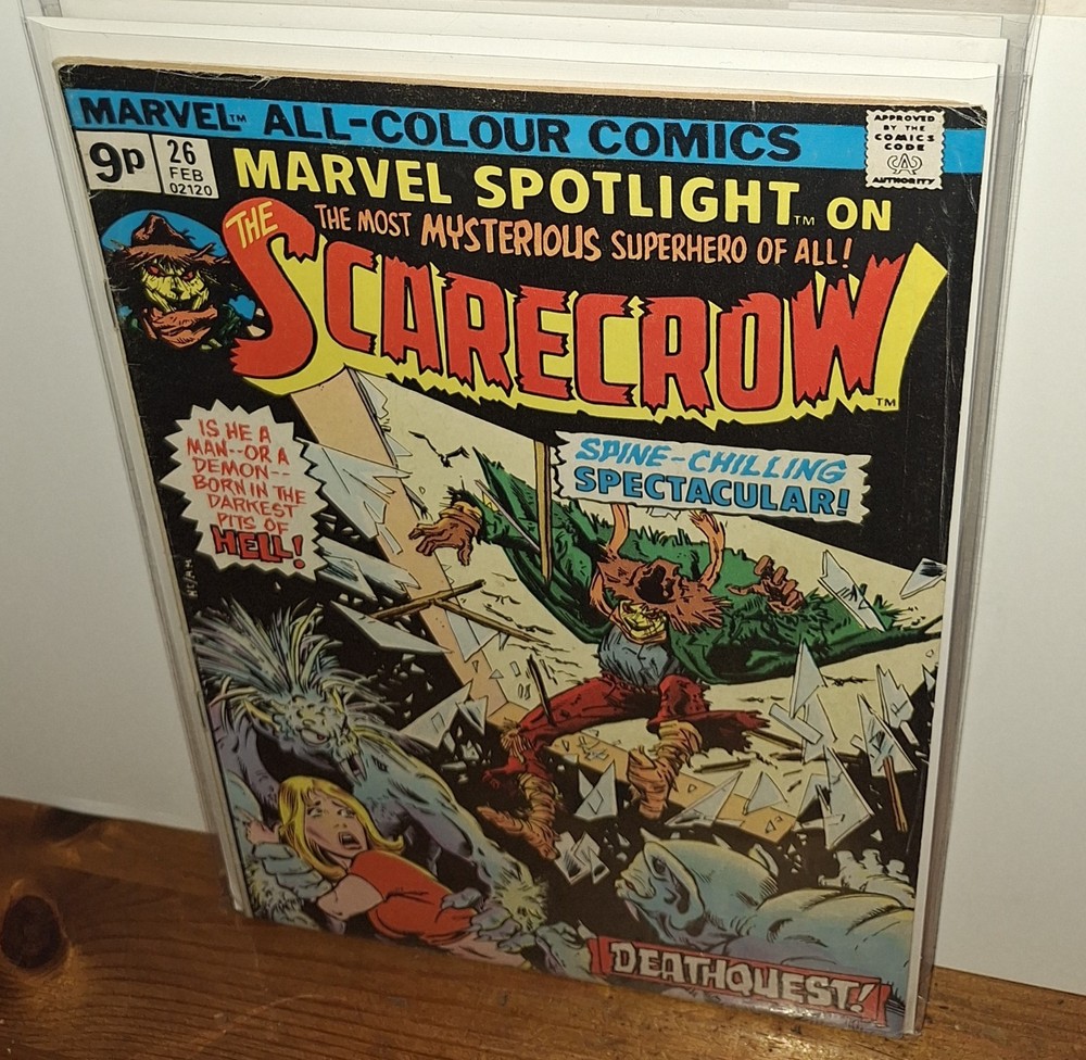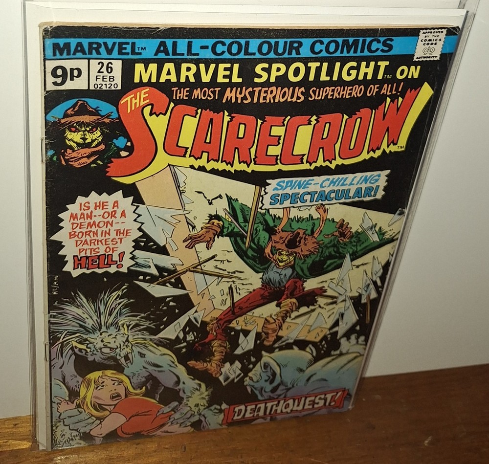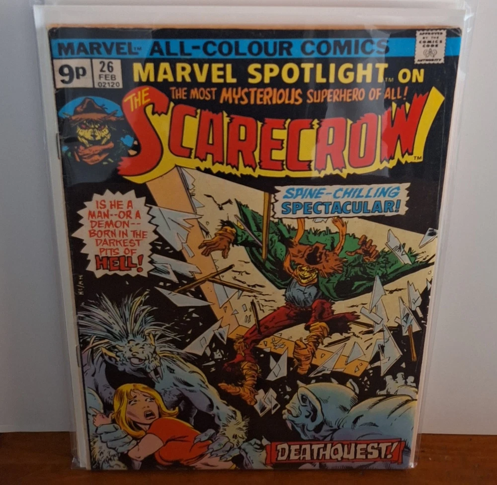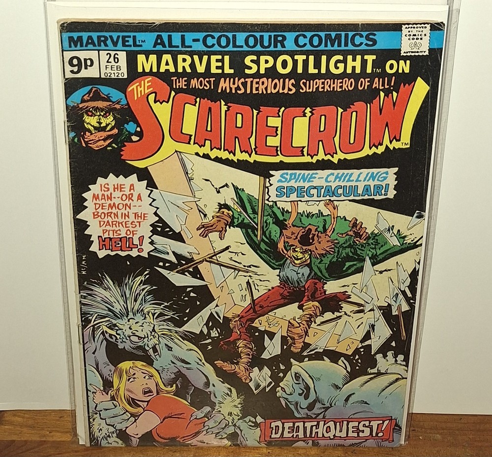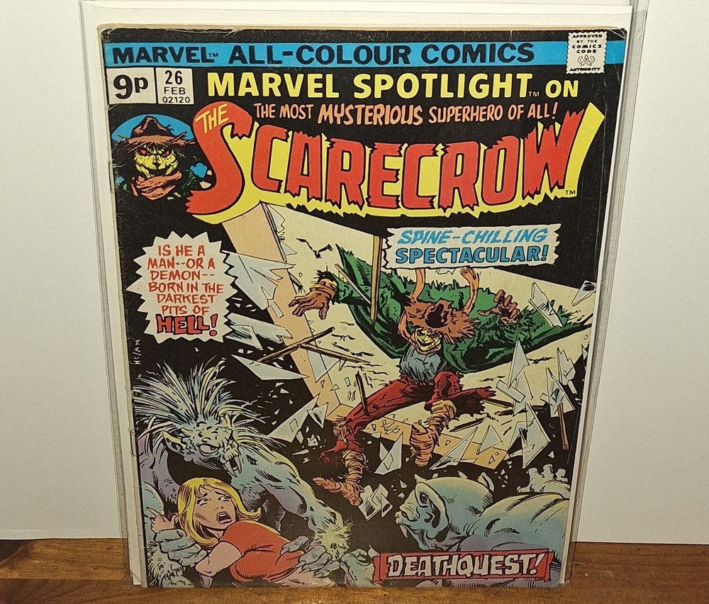 The Marvel Spotlight #26 comic book, featuring the character Scarecrow, is a rare UK variant from 1975. Written by Marv Wolfman, Dan Green, and Sal Buscema, with cover art by Howard Chaykin and Al Milgrom, this Bronze Age comic from Marvel Comics is a must-have for fans of superheroes and adventure. With a focus on the Scarecrow superhero team, this first printing comic offers a unique glimpse into the Marvel Universe, combining elements of action, adventure, and horror & sci-fi in a softcover format.