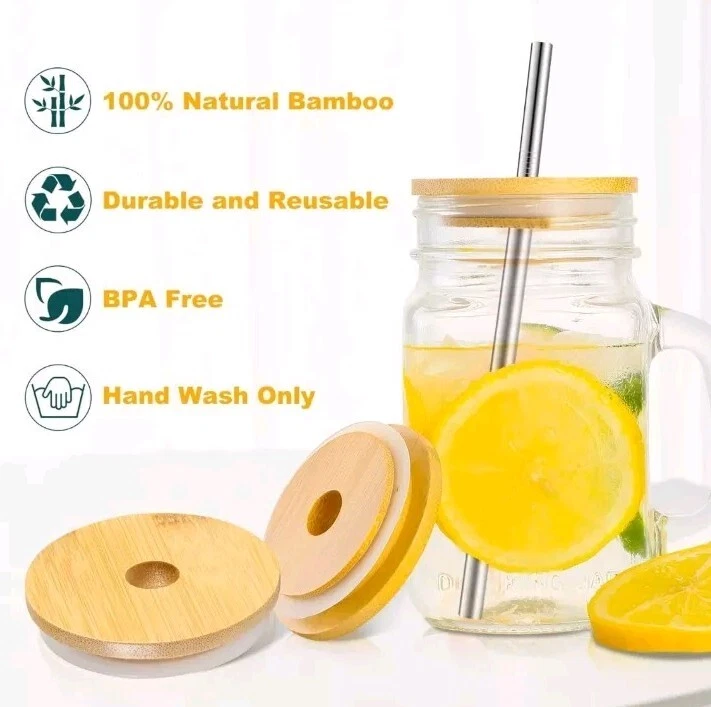 The set includes 8 wide mouth bamboo lids for Mason jars, along with metal straws and a cleaning brush. Perfect for eco-friendly and stylish drinkware, the lids are designed to fit 86mm Mason jars. The metal straws and brush make it easy to enjoy your favorite beverages while reducing single-use plastic waste.