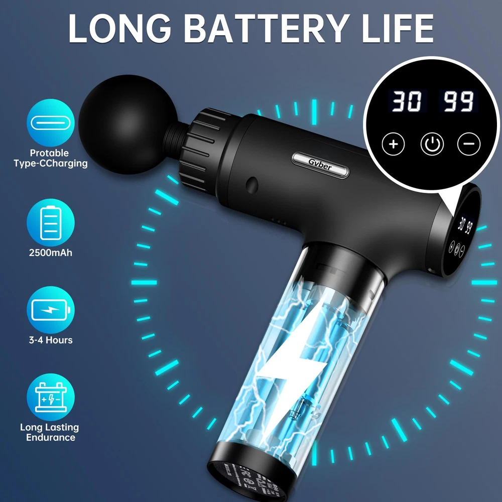 9 Massage Heads: This massage gun features 6 interchangeable massage heads (D-shaped, bullet, flat, thumb, U-shaped) designed to target different muscle groups and provide customized relief through percussion massage technology Relieve Soreness & Back Pain and Stress: 30-speed levels, you can easily customize the intensity of your massage, ranging from gentle awakening of muscles to a deep, professional-like massage. Including options for deep tissue. Ideal for use in your legs, arms, back, torso and neck shoulder Features: Built with high-quality materials for durability, this massage gun features a smart LED display showing speed and battery levels, along with a simple on/off button operation Powerful Yet Quiet: Featuring a lightweight and ergonomic design, this massage gun is an ideal travel companion, allowing you to take it with you to the gym, office, or on vacation. It works silently so you can use it without disturbing others Extended Battery Life: Constructed with high-quality materials, Mini Massage Gun is built to last. With rechargeable battery & smart LED display: Powered by a rechargeable battery. The built-in display shows off speed and battery percentage, so you always know when to charge.(Note: The on button is on the LED screen, press and hold for 2 seconds to switch on, and press and hold for another 2 seconds to switch off)