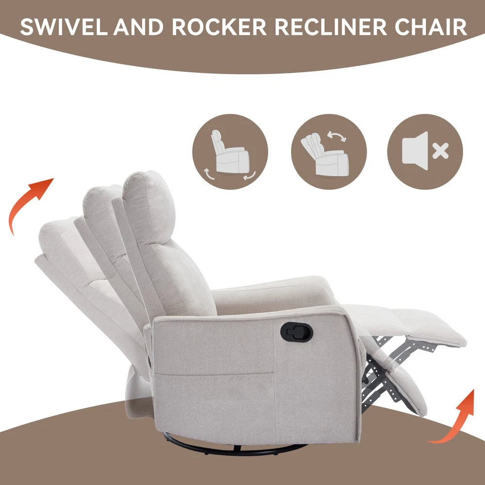 Heated Massage Swivel Chair 360° Rocking Nursery Chair Fabric Upholstered --------------------------------------- --------------------------------------- Description: When you drag your tired body, exhausted all the energy, back home. If you have our recliner chair with stylish appearance, I believe that our rocking chair can quickly help you relieve the fatigue state. --------------------------------------- --------------------------------------- Features: 360°SWIVEL AND ROCKING RECLINER: The swivel recliner chair has a black metal base that allows for a smooth and gentle 360 degree swivel, and the function of rocking can also make you feel more comfortable and relaxed. You can pull the side button to control the recline of the recliner chair, which means you can get any position you want, it's reclining 155 degrees maximum. MASSAGE & LUMBAR HEAT FUNCTIONS: It comes with 8 vibrating nodes (back, lumbar, thighs, legs) and 3 massage modes for selection, each massage point can be operated individually. There is timer function in 15/30/60 minutes which is convenient for you to set massaging time. Add a lumbar heat point to promote blood circulation throughout your body, providing a full body relaxation! EASY ASSEMBLY: Depending on the unique structure and design, it's simple to assemble the chair, and also no tools are needed (about 10 minutes for a novice). IMPORTANT NOTE: The large recliner chair comes with 1 box. In addition, If you have any concerns regarding your health, consult your doctor before using the product. --------------------------------------- --------------------------------------- Specification: --------------------------------------- --------------------------------------- Package including : 1 pc of swivel rocking chair 1 x manual --------------------------------------- --------------------------------------- ABOUT US: SUNCO welcomes your arrival, we focus on higher quality furniture products. We aim to provide you with a more convenient and relaxing life, hoping to help you and you loved one to enjoy more leisure time. SHIPPING: (1) When we receive the order, we will immediately check the order. If the information of the order is insufficient, we will email you immediately. Please check the email within the first day after purchasing the product to avoid the delay delivery. (2) Under normal circumstances, you will receive the goods on 2-8 working days. If the address belongs to remote areas, the time will be longer. Please understand if encounter blizzard weather. (3) Currently, we do not ship to APO/FPO/PO Boxes. RETURN POLICY【Ask the seller a question】: (1) For damaged or defective items, just contact us using the " Ask the seller a question" link on eBay, please send pictures for us to check. We will help you within 24 hours and provide good solutions as soon as possible. (2) For the wrong purchase, no longer need, not in line with expectations or the items rejected during delivery: Please contact us to get an authorization and returning address before sending the item back.If an item is returned because of an undeliverable shipping address, buyer agrees to pay the cost for re-shipment. (3) Cancellation order: You can cancel the goods at any time before they are shipped. If the tracking number has been uploaded, please contact us and we will help you. CONTACT US【Ask the seller a question】: If you have any questions, please contact us at any time. Due to the time difference, we may not be able to reply to you immediately, but we will definitely reply to you within 24 hours. (It may just a little longer during weekend or holiday,but we will do best to reply within 2 days.Your understanding is highly appreciated.)