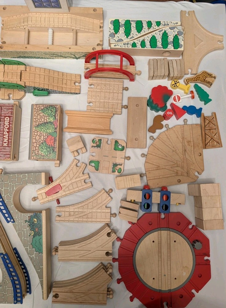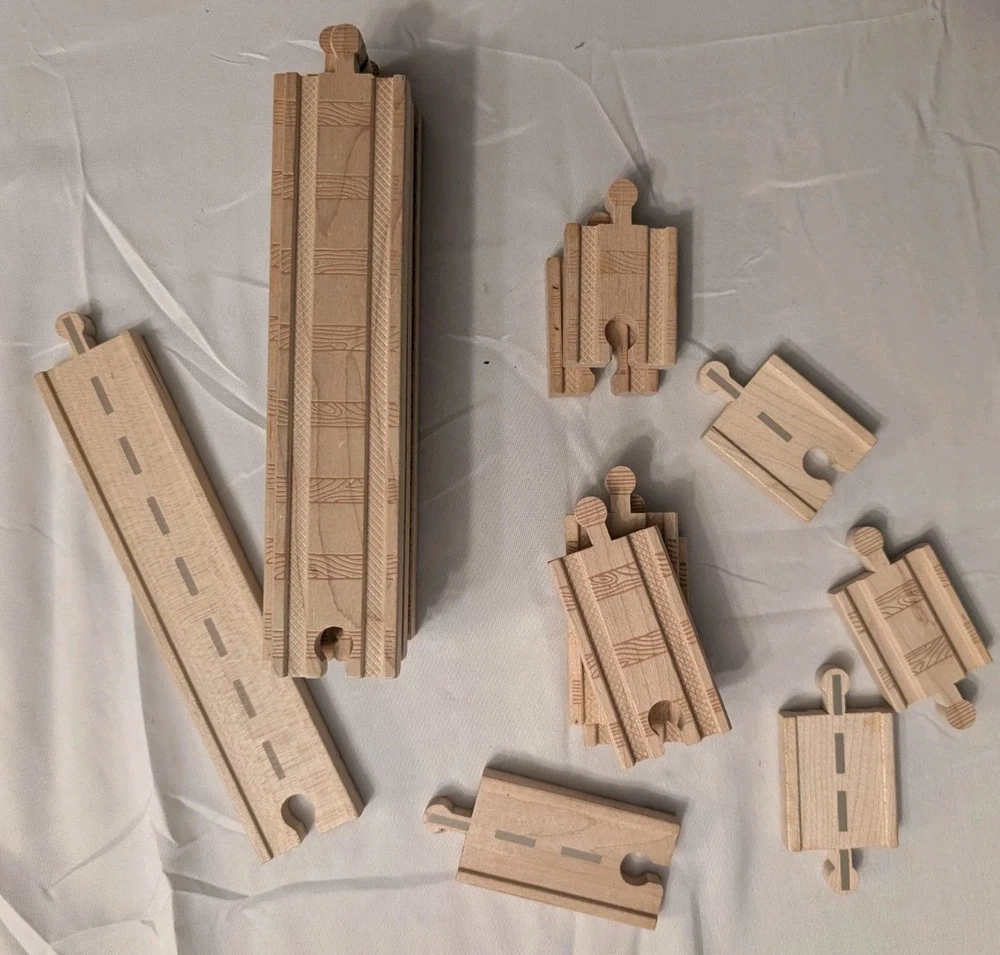 I counted 337 individual pieces. Train tracks come from a mixed set from late 90s to early 2000s. See photos for details! Some tracks double as roadways when flipped. 16 pieces are plastic, not wood. Lot weighs just under 50 pounds and is quite large so please keep in mind regarding shipping. Local pickup is also available.