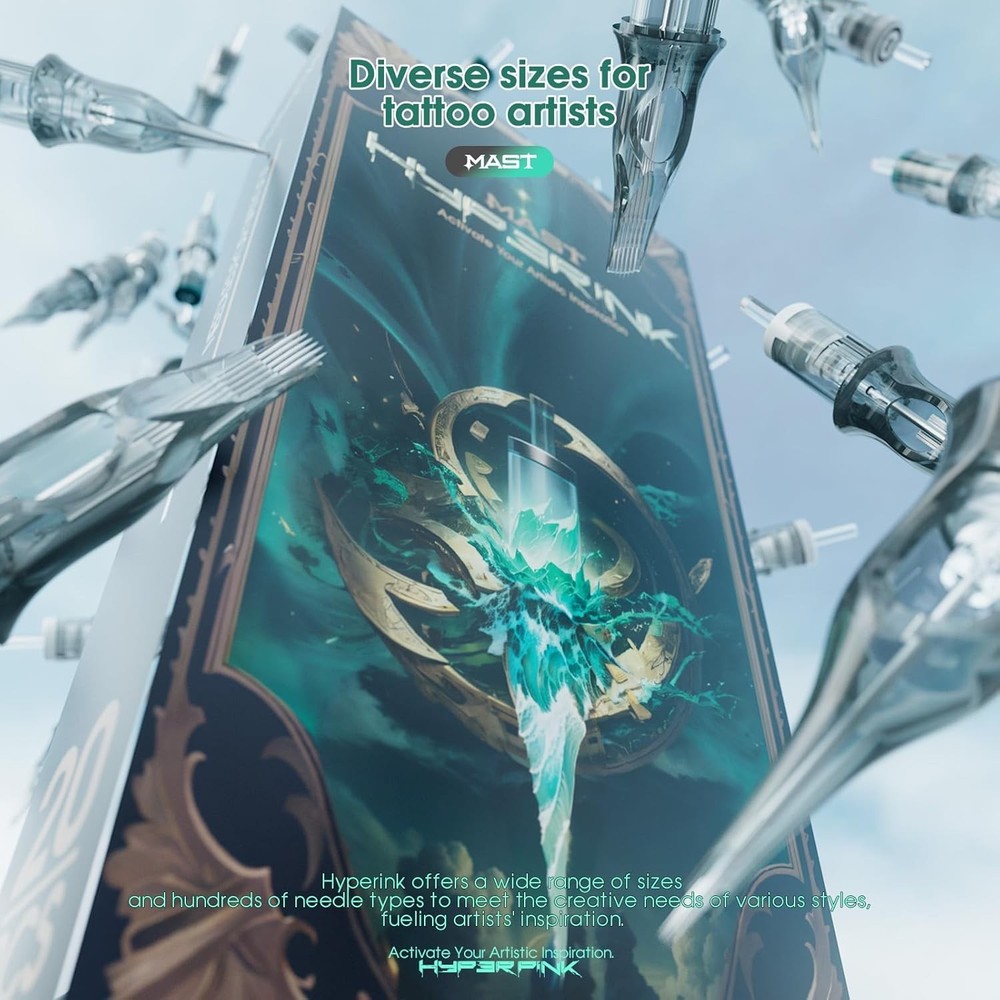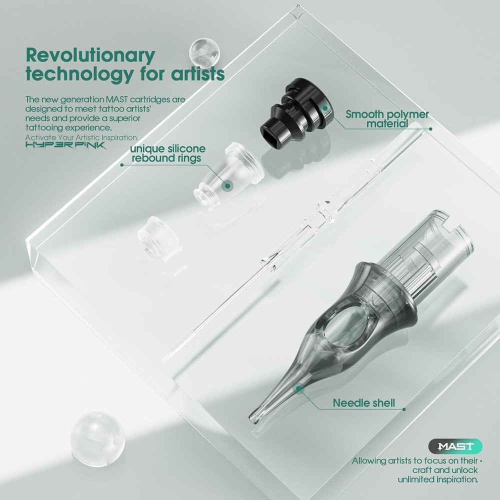 Revolutionary Technology for Tattoo Artists: Discover the Mast Hyperink tattoo needles cartridges, featuring cutting-edge needles. Designed to elevate tattooing standards, our cartridges offer 10% greater durability and coloring efficiency. Experience consistent ink distribution and enhanced stability throughout every tattoo session. Built to Last with Durability: Crafted with a new hardness standard and premium materials, our cartridges ensure unparalleled longevity. Tattoo artists can rely on sustained performance, focusing on their art without interruptions or equipment concerns. Precision Craftsmanship for Artistic Excellence: Achieve precise tattooing with our meticulously engineered Mast Hyperink tattoo needles cartridges. Featuring ergonomic designs and effortless cartridge-to-machine locking, each detail is optimized for accuracy. Embrace flawless contours for bringing creative visions to life. Superior Performance for Lasting Impressions: With millions of proven cartridges, Mast continues to set benchmarks in tattoo artistry. Our Hyperink range delivers outstanding performance, meeting the exacting demands of professionals. Whether creating bold lines or intricate details, expect exceptional results that endure. Exceptional Quality and Confidence: Count on Mast commitment to excellence with our state-of-the-art production facilities. Operating under strict quality standards, our wild-scale, dust-free environment ensures consistency and peace of mind. Trust Mast Hyperink for superior quality in every tattoo session.