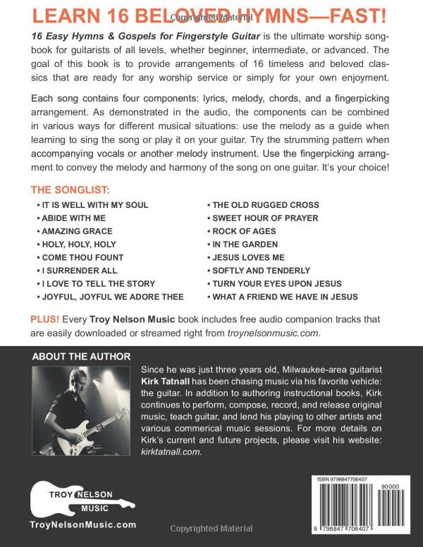 Book Title:16 Easy Hymns and Gospels for Fingerstyle Guitar:Number of Pages:96Format:PaperbackAuthor:Tatnall, KirkLanguage:EnglishPublisher:Independently published