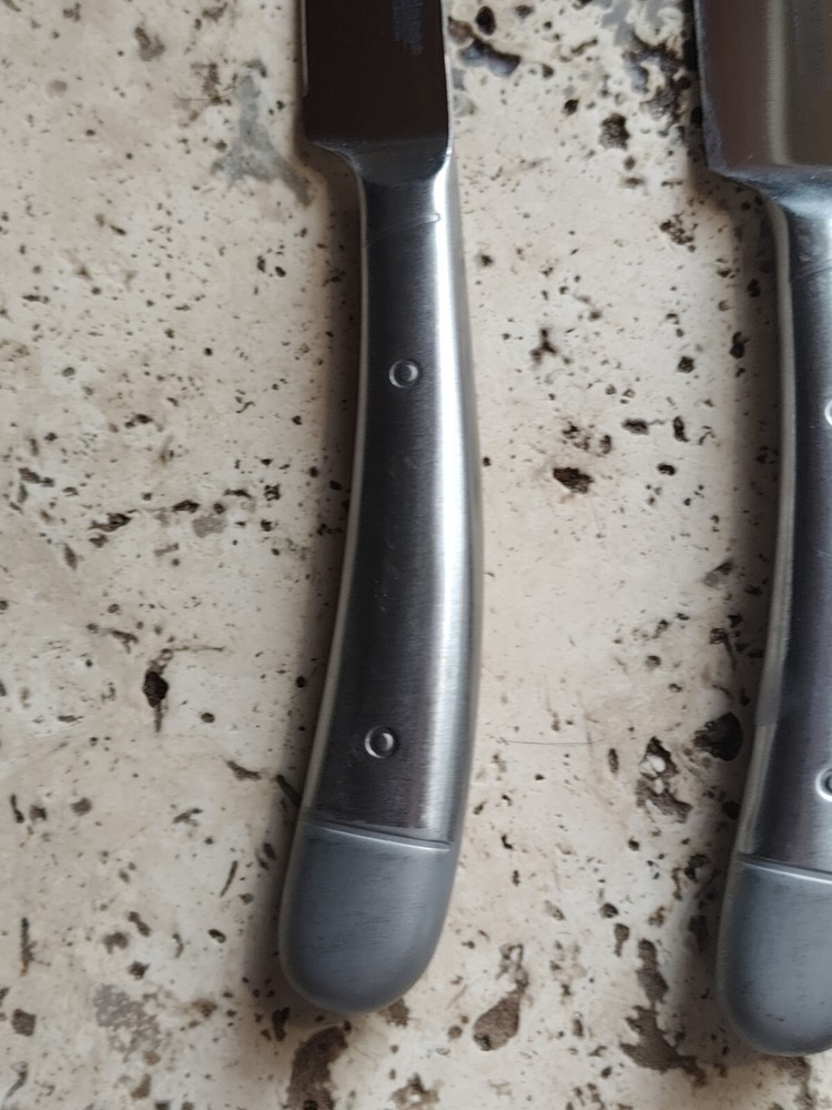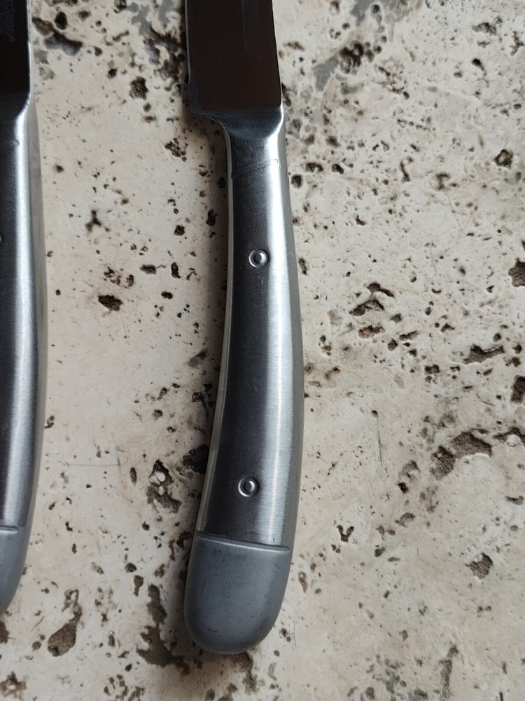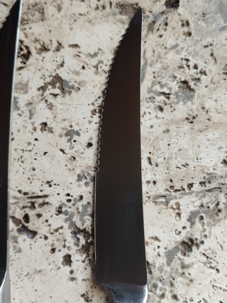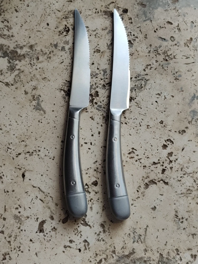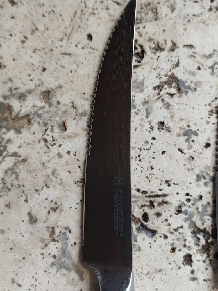 The Masterclass Premium Collection includes 2 serrated steak knives with a 5" stainless steel blade and a total length just shy of 10". These knives are designed for universal food compatibility and feature a stainless-steel handle for durability and a sleek modern look. Both are preowned showing wear from use including scratches and buffs to the blade and handle.