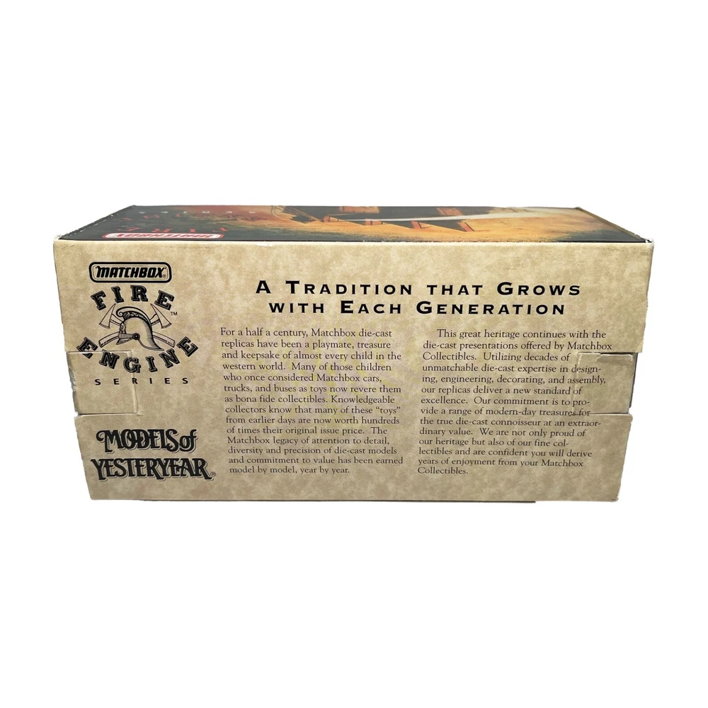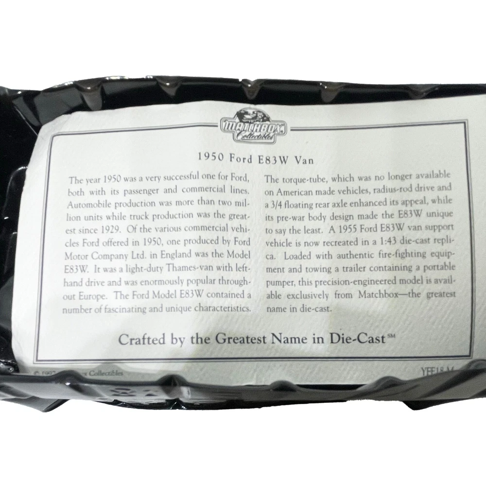 Explore the nostalgia of vintage firefighting with the Matchbox 1950 Ford E83W Van YFE18, part of the cherished Matchbox Models of Yesteryear series. This detailed diecast model replicates the historic fire engine truck in true 1:43 scale, capturing the essence of the era with its vibrant red color and classic design.Crafted with precision, the YFE18 is a must-have for collectors and enthusiasts of fire vehicle memorabilia. Its 1997 year of manufacture reflects the dedication to quality and historical accuracy that Matchbox is known for. Ideal for display, this model is a tribute to the engineering of the past and a homage to the brave men and women who served aboard these iconic fire trucks. EUC Box included