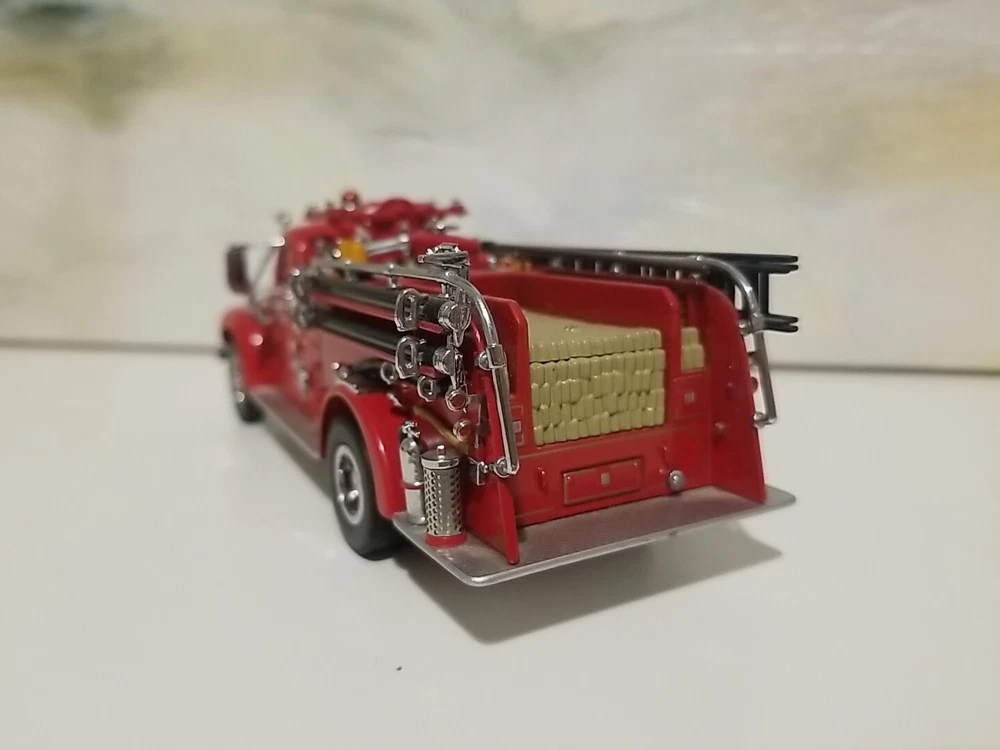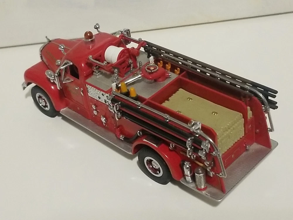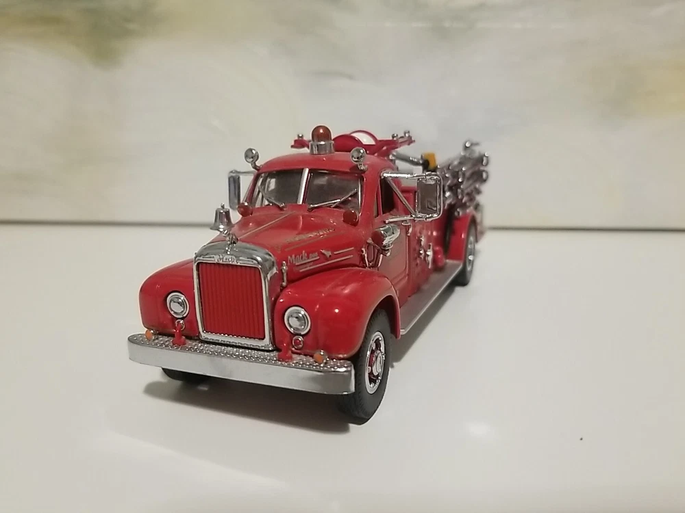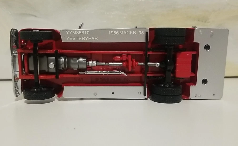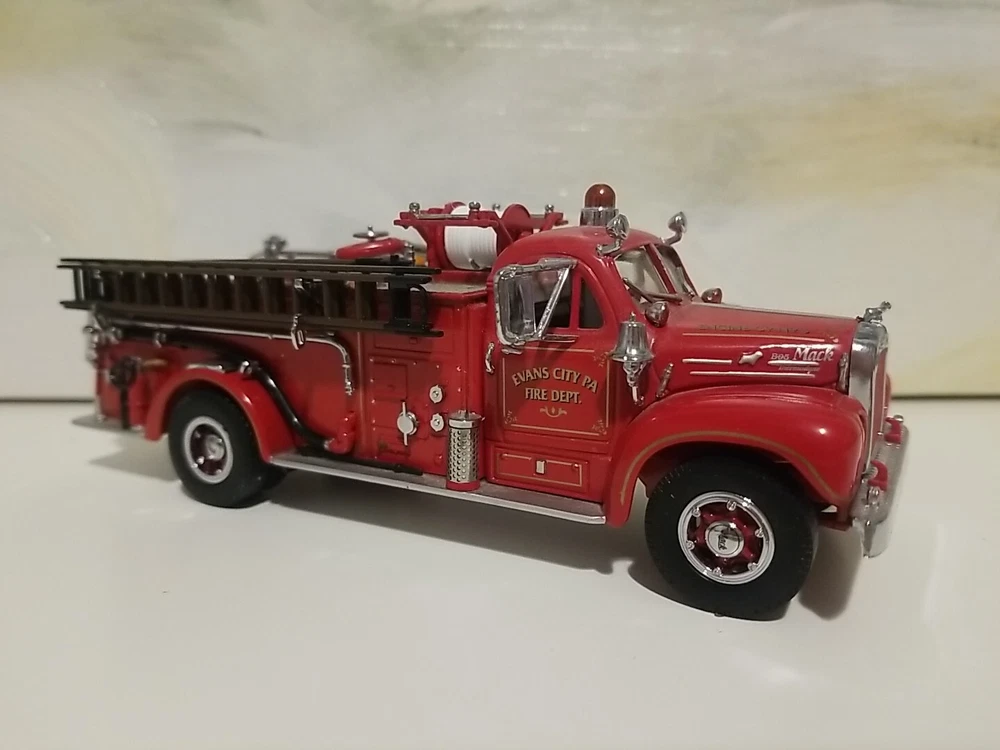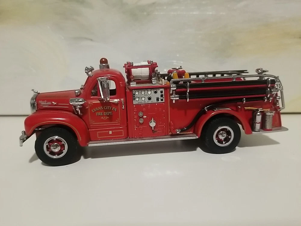 The Matchbox 1956 Mack B-95 Pumper Fire Truck Engine is a diecast model of a classic fire truck from the Models Of Yesteryear series. This special edition vehicle in 1:45 scale features a red color scheme with details specific to the Evans City, PA Fire Department. This collectible is a detailed replica of a 1956 fire engine, suitable for display by enthusiasts aged 15 and up. The model was manufactured in 1998 in China for Matchbox.