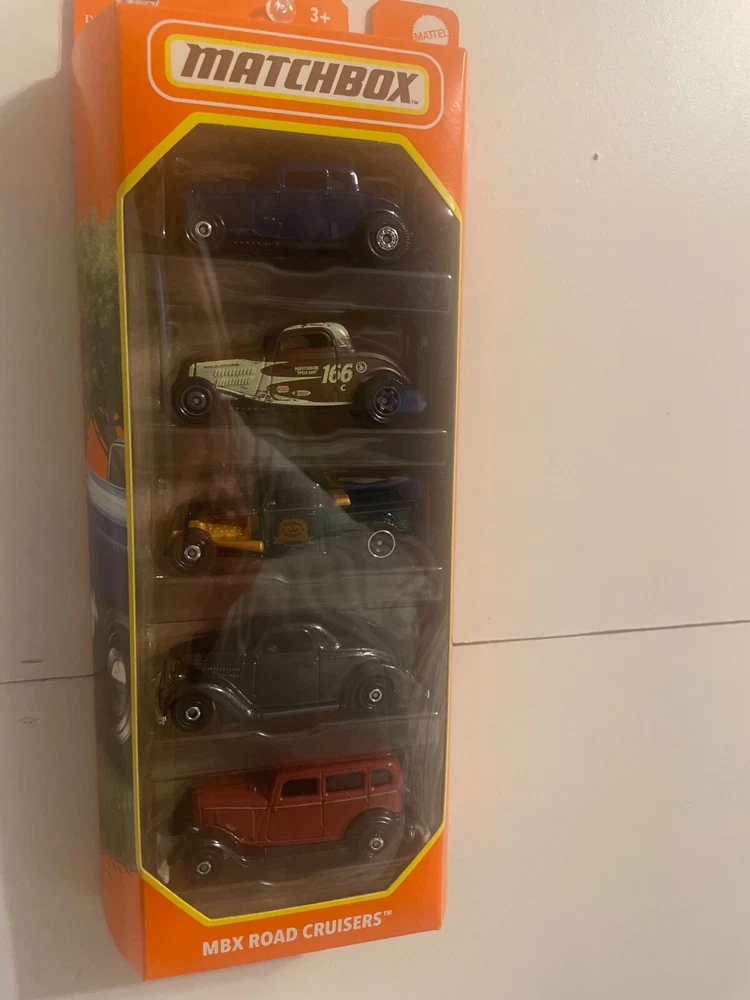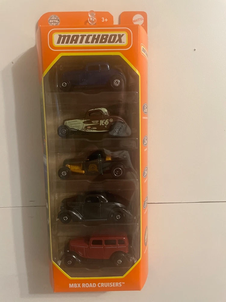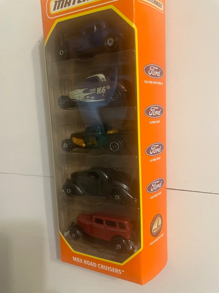 The Matchbox 2024 MBX Road Cruisers 5-Pack features a mix of diecast vehicles, including a Ford Coupe, part of the Ford/Plymouth series. This 1:64 scale set is designed under the theme of "MBX Road Cruisers." The collection is from the Matchbox brand, known for producing quality toy vehicles. This 5-pack is a sought-after item for collectors and enthusiasts due to its variety and potential rarity, marked as VHTF (Very Hard To Find).