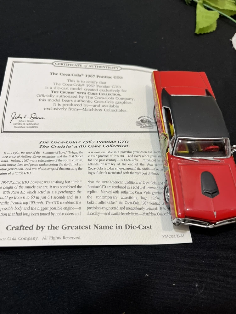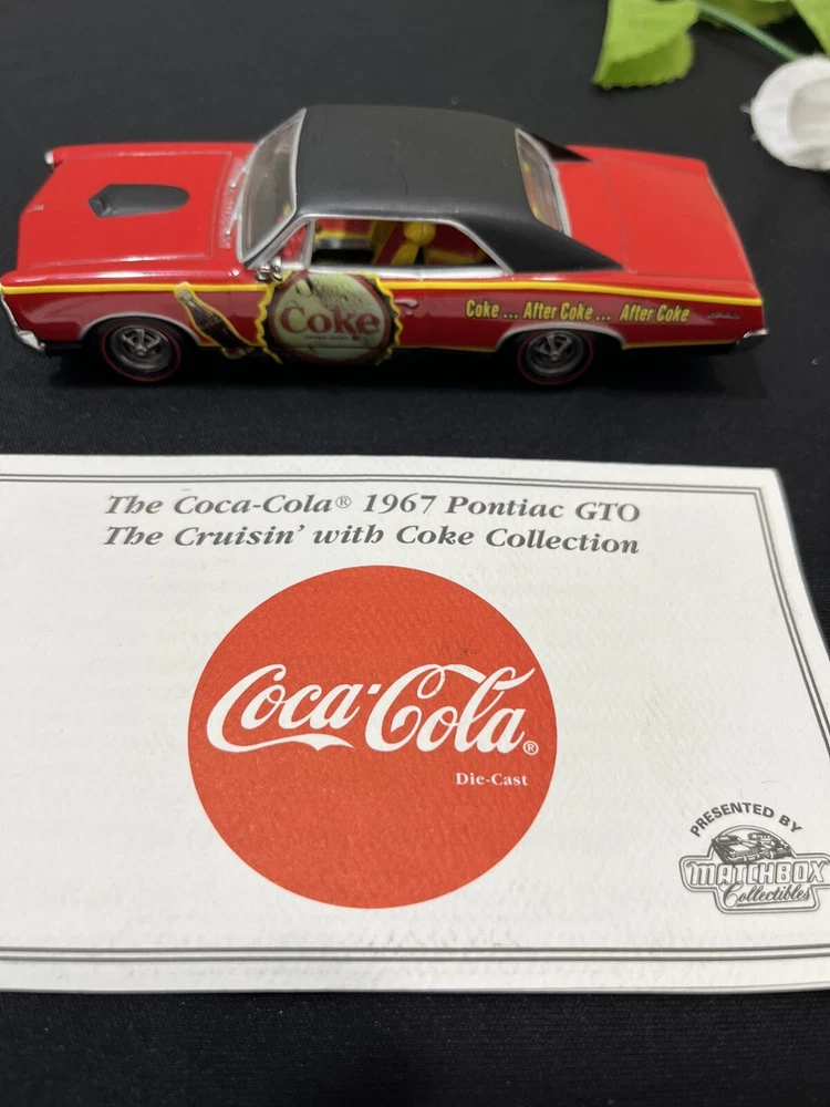 This Matchbox Collectible Coca-Cola 1967 Pontiac GTO Diecast Car is a must-have for any car enthusiast or collector. The iconic red color and Coca-Cola branding make this model a standout addition to your collection. The diecast material and intricate details ensure the authenticity and quality of this model. The 1967 Pontiac GTO is a classic car that has been faithfully recreated in this Matchbox Collectible. With a certification of authenticity, you can be sure that this model is a genuine collector's item. Add it to your collection today and relive the glory days of American muscle cars. Preowned by a collector and kept in good condition, this great car comes with a certificate of authenticity. Sorry, I do not have the box.