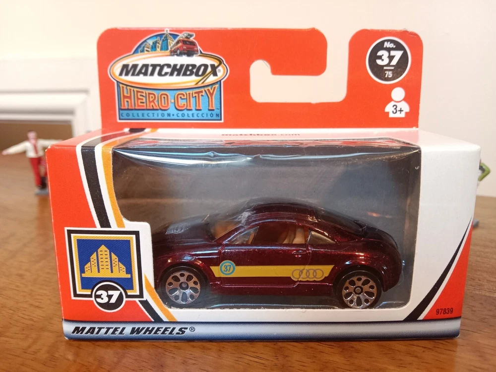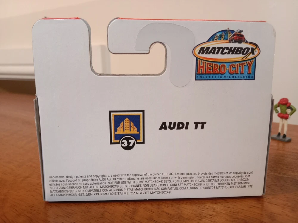 The Matchbox Hero City Audi TT No.37 is a 1:64 scale die-cast model car manufactured by Matchbox in 2002. This collectible vehicle, featuring the Audi brand, comes in a vibrant red colour and is new in its original box which shows minor wear from storage. Made in China by Mattel, this toy car is a part of the Matchbox Hero City series, ideal for collectors and fans of contemporary die-cast vehicles.