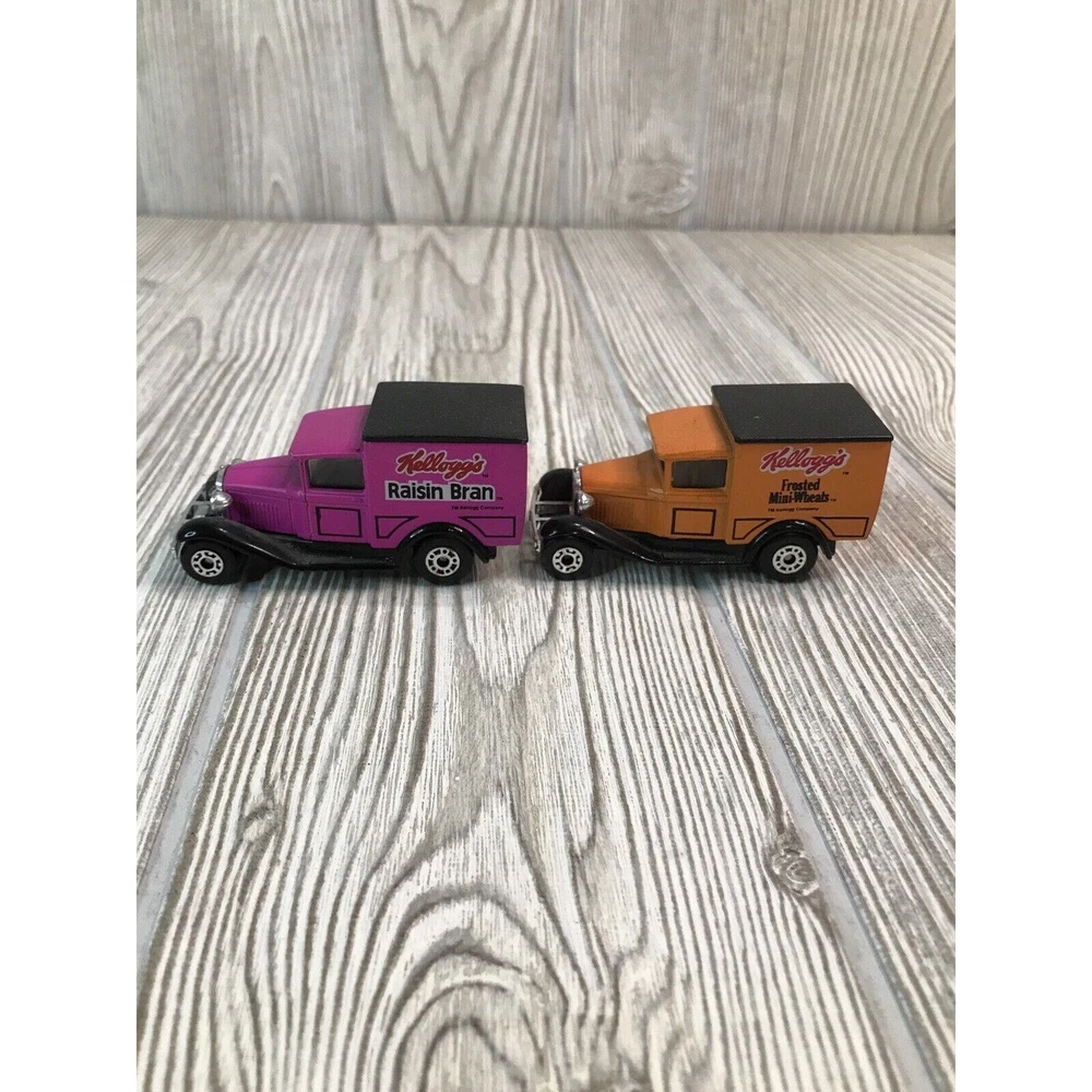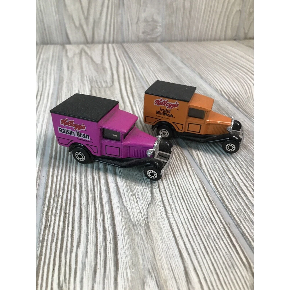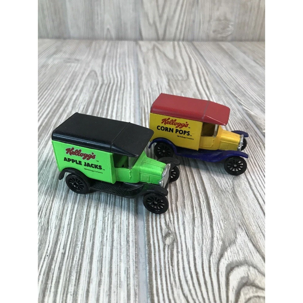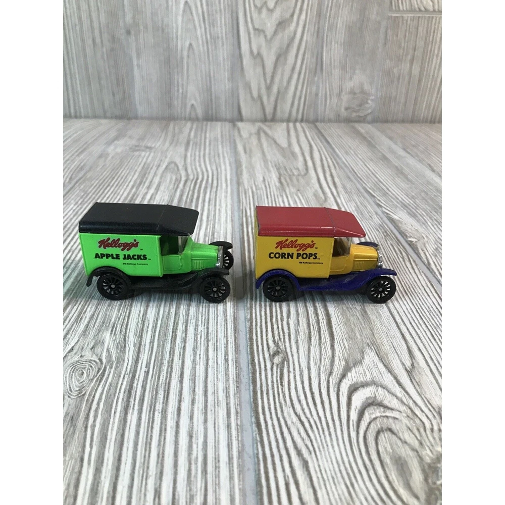 Lot Of 4 Matchbox Die cast 1:52 Scale Cars. Kellogg’s Cereal Advertising. 2 Ford Model A's and 2 Model T's. Vintage Kellogg's Raisin Bran and Frosted Mini-Wheats Model A's from 1979. Kellogg's Apple Jacks and Corn Pops 1921 Model T's from 1989.