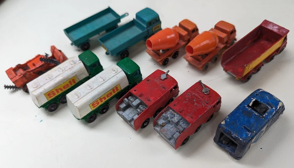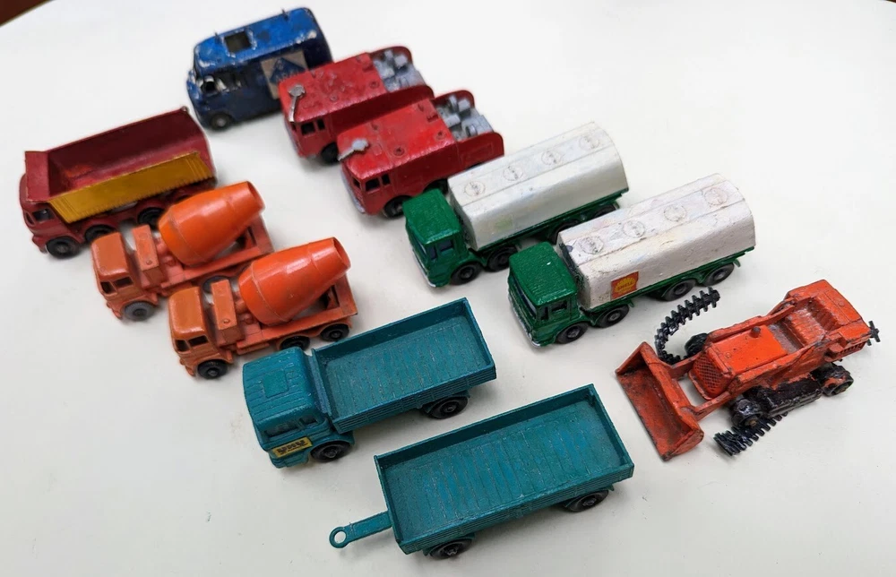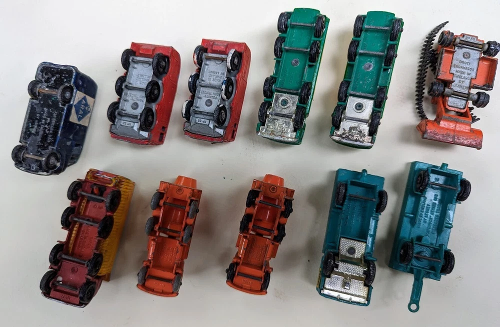 This lot of 11 vintage Matchbox Lesney trucks is a must-have for any collector or fan of diecast vehicles. These trucks were manufactured in the 1970s in the United Kingdom and feature a colorful and detailed design. Each truck is made of metal and is in good condition making them perfect for display or play. The scale of these trucks is 1:64 and they are from the Matchbox series by Lesney. The trucks in this lot are perfect for boys and girls who love vintage toys and vehicles. Some of this set are customized and all of these come from the Matchbox character family. These trucks are a great addition to any collection and are sure to impress. Listed by the original owner. Includes # 1, 2, 7, 26 (2), 32 (2), 58, 62, 63 (2)