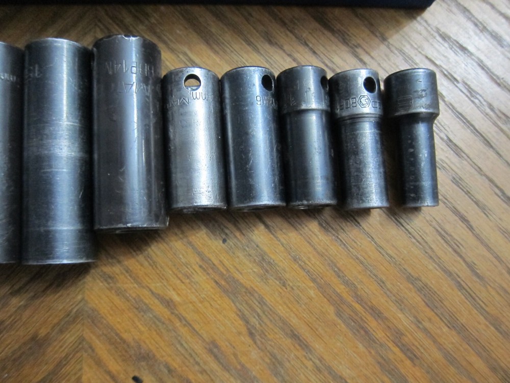 Matco 3/8 drive deep socket set with tray sizes are, 19mm, 18mm, 17mm, 16mm, 15mm, 14mm, 13mm, 12mm, 11mm, 10mm, 8mm, expect some wear corrosion usa shipping