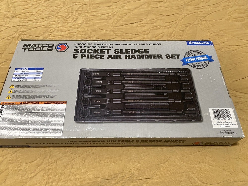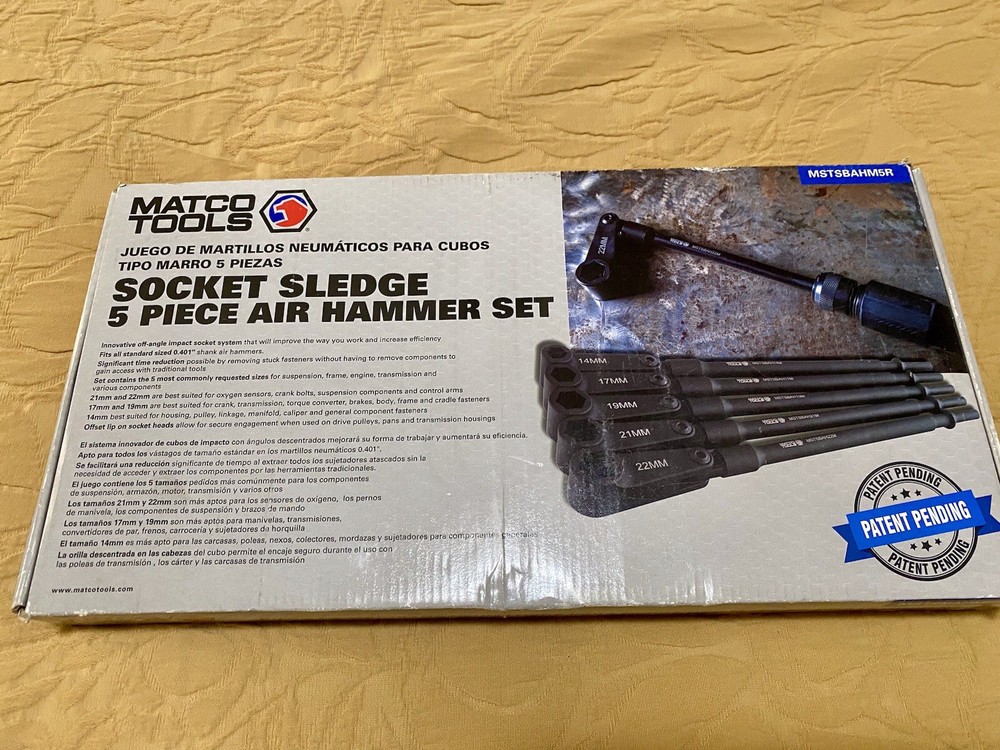 The Matco Tools Socket Sledge 5 Piece Air Hammer Set includes impact sockets in metric sizes ranging from 14mm to 22mm. This set is designed for use with air hammers and is ideal for automotive and industrial applications. With a durable construction and no warranty, this set is perfect for professionals looking to add high-quality tools to their toolbox. The manufacturer part number ensures easy identification and compatibility with Matco Tools products.