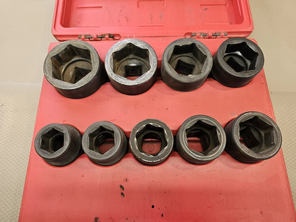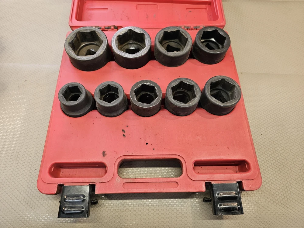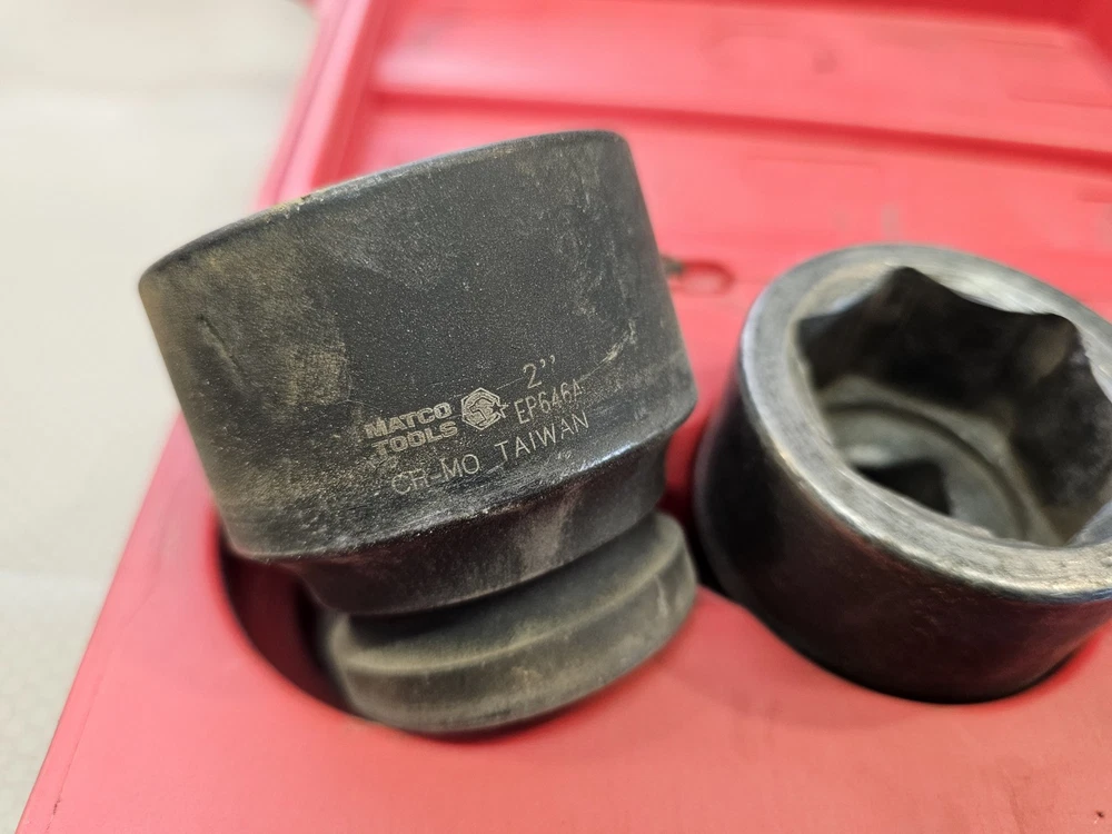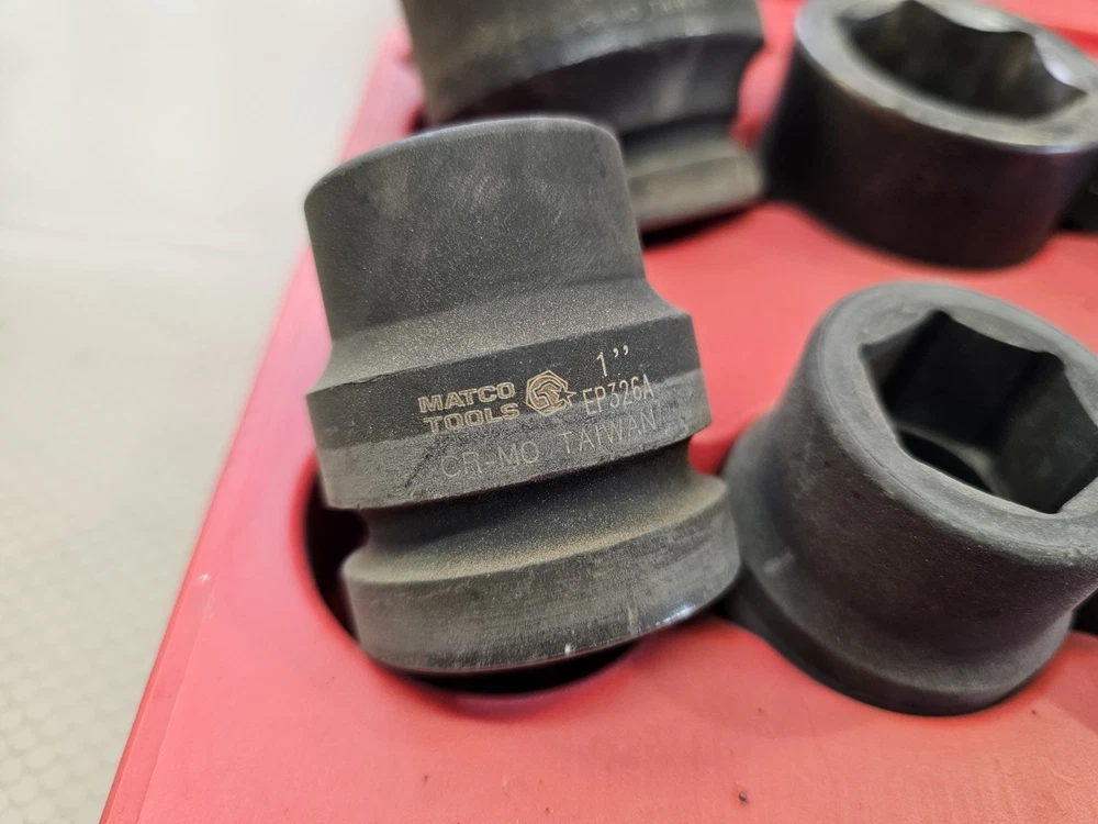 Matco Tools 9 SAE 1 Inch Drive Impact Socket Set 2 inch to 1 inch red snap case. Condition is Used. Shipped with USPS Ground Advantage.