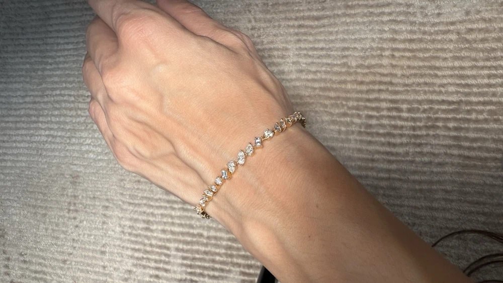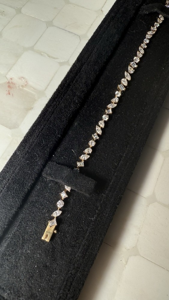 classic tennis bracelet, with 38 fancy shape diamonds suspended in 18K white, rose, or yellow gold. Infinitely versatile, this bracelet makes a striking & playful addition to your repertoire. PRODUCT DETAILS 18K white, rose, or yellow gold 4.00 carats of diamonds Approximately 0.08-0.10 carats per stone G/H color and VS-SI clarity