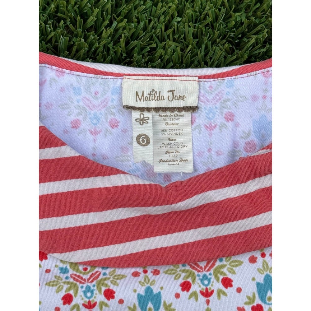 Matilda Jane long sleeve top showcases a vibrant mixed print design with floral, geometric, and striped patterns in red, blue, and white. This whimsical piece features a unique asymmetrical fold-over collar accented with two decorative buttons and a tiered ruffle hem for a playful, boutique aesthetic. Crafted from a soft cotton-spandex blend, it offers a comfortable stretch fit perfect for everyday wear or special occasions. Brand: Matilda Jane Style: Mixed Print Tunic Material: 95% Cotton, 5% Spandex Neckline: Asymmetrical Collar Sleeve: Long Sleeve Pattern: Floral, Striped, Geometric Hem: Ruffle Color: Red, White, Blue Closure: Pullover Accents: Buttons Keywords: Boutique, Shabby Chic, Whimsical, Cottagecore, Mixed Media, Playwear, Colorful, Pattern Play, Girly, Spring, Fall, School Outfit, Designer Kids Item is preowned, effort has been made to ensure all flaws are displayed photos serve as additional description Sizing varies by manufacturer and time period, please see measurements.