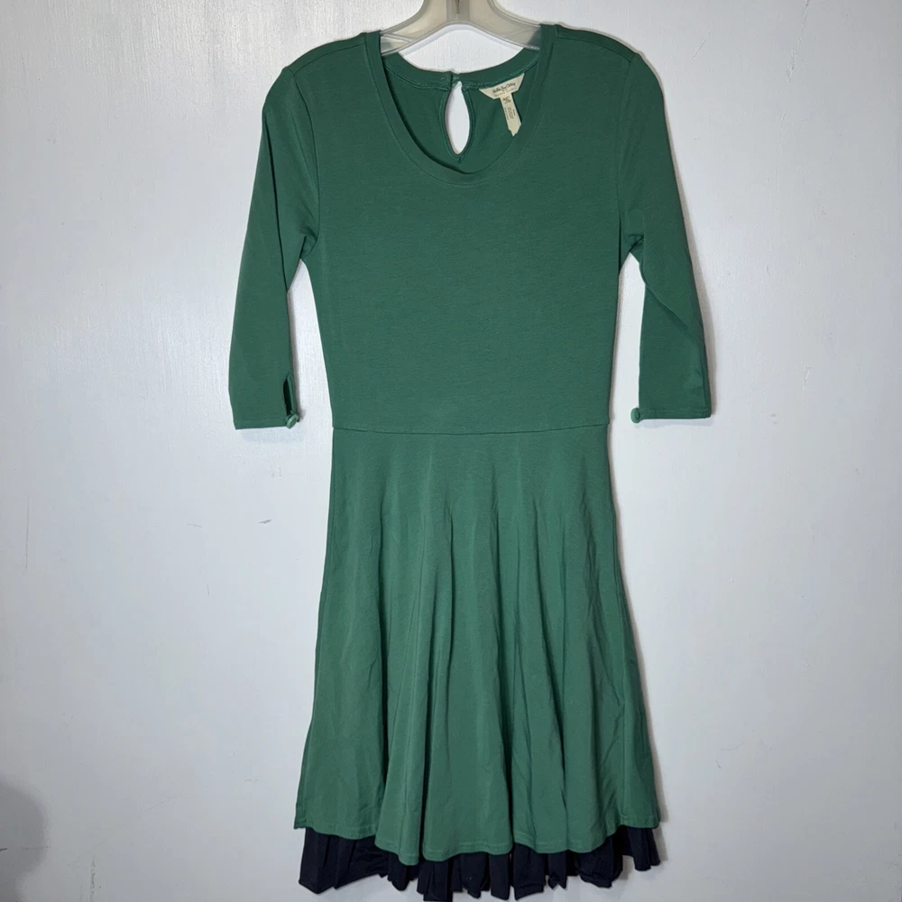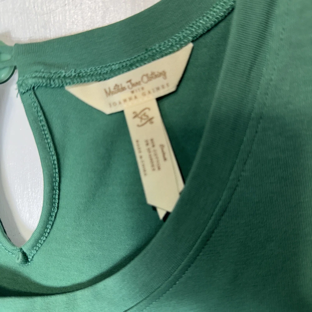 This Matilda Jane Joanna Gaines Pasture Dress is perfect for any occasion, whether it's a wedding, party, or just a casual day out. The dress features a solid green color and is made from a blend of spandex, cotton, and cotton blend materials, making it comfortable and stretchy. The dress has a scoop neckline, 3/4 sleeves, and a knee-length hemline. The dress also has some great accents, including ruffle details, button closures, and a layered design with the Matilda Jane logo. It's machine washable, making it easy to care for, and is available in an XS size. This dress is a great addition to any wardrobe and is perfect for any season.