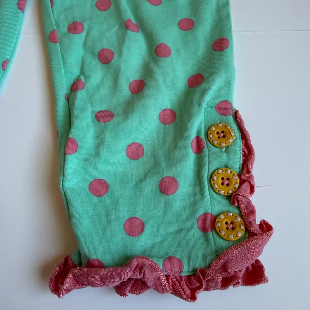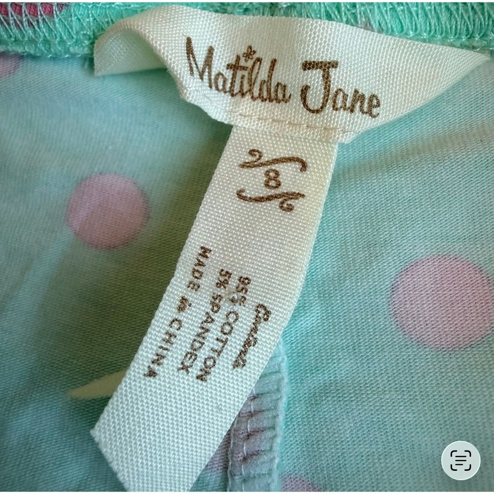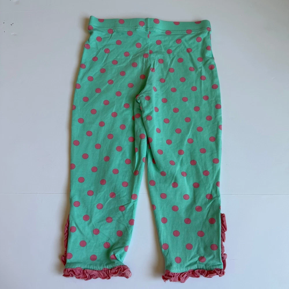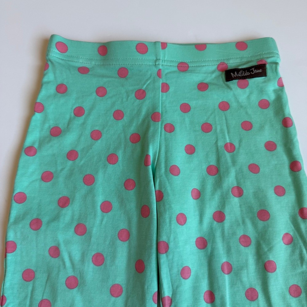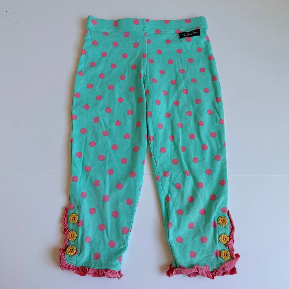 Girls 8, Matilda Jane, Lots of Dots cropped leggings from the Spring 2019 Brilliant Daydream collection. Mint and pink polka dots with ruffle & buttons on hem. Elastic waistband. 95% cotton 5% spandex. No stains or flaws, light wear, great used condition. F-4668
