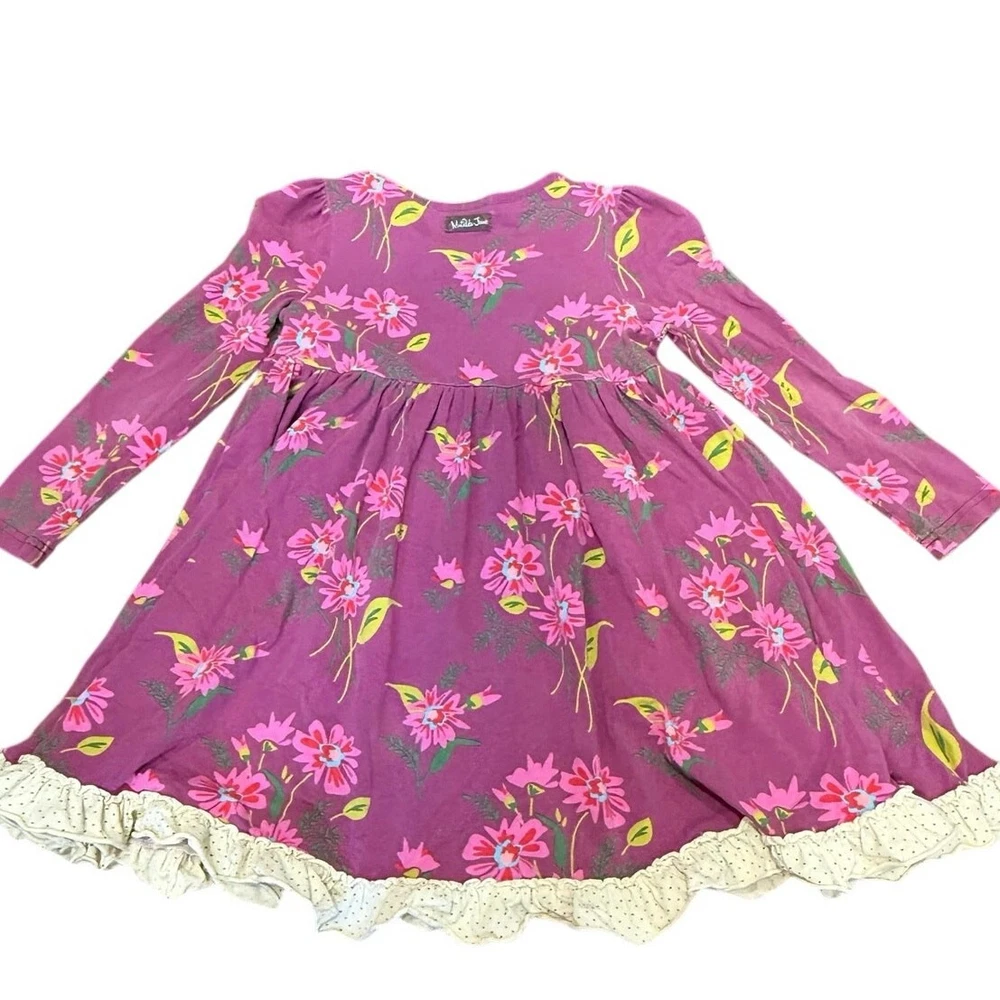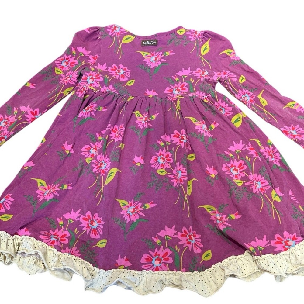 Adorable and classic Matilda Jane “Blossom Lap Dress” from the Paint by Numbers Fall 2013 collection. Features a rich plum background with bright floral print in pink and lime green, accented by a ruffled aqua-and-chartreuse neckline and cream polka-dot hem trim. Size: 6 Condition: Good used condition — normal wash wear consistent with age, no holes or stains noted. Please note this is from 2013, not a new dress. Fabric: 95% cotton, 5% spandex (soft knit stretch) Care: Machine wash cold, line dry Details: Long sleeve, swingy A-line silhouette, ruffle trim, floral print From the Paint by Numbers collection — a beloved, hard-to-find classic!