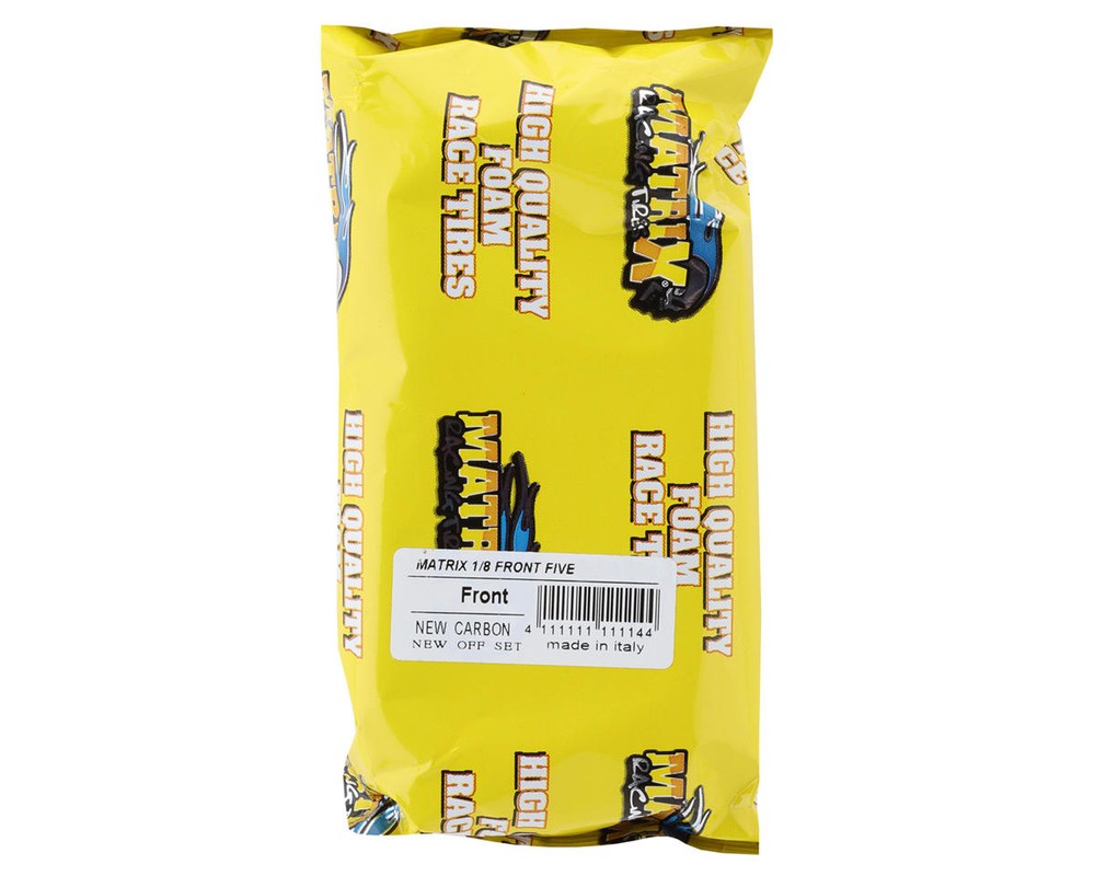 Tire Overview: Matrix Tires 37mm 1/8 On-Road Foam Rear Tires. These Italian On-road tires provide optimal performance and grip under high-speed and high-stress racing conditions. Matrix combines advanced materials, construction techniques, and Italian design elements to provide high levels of grip, durability, and performance required for competitive racing. Available in a large range of compounds from 25 - 45 Shore as well as Variable Compounds to optimize performance in different areas, such as providing more grip on the outer edges for cornering and a stiffer compound in the center for straight-line speed. Features: Fully automatized manufacturing system cuts, glues, and packages tires in Busto Garolfo Italy Carbon rim increases lateral stiffness and maintains better tire contact with the track surface during cornering, improving grip and handling Pin style drive hub compatible Available in three wheel compounds (Light, Precision, and Carbon) Large variety of compounds available to suit your track and setup sleek split five style spokes Includes: (2) Pre-mounted 37mm Foam tires About Us | View Store