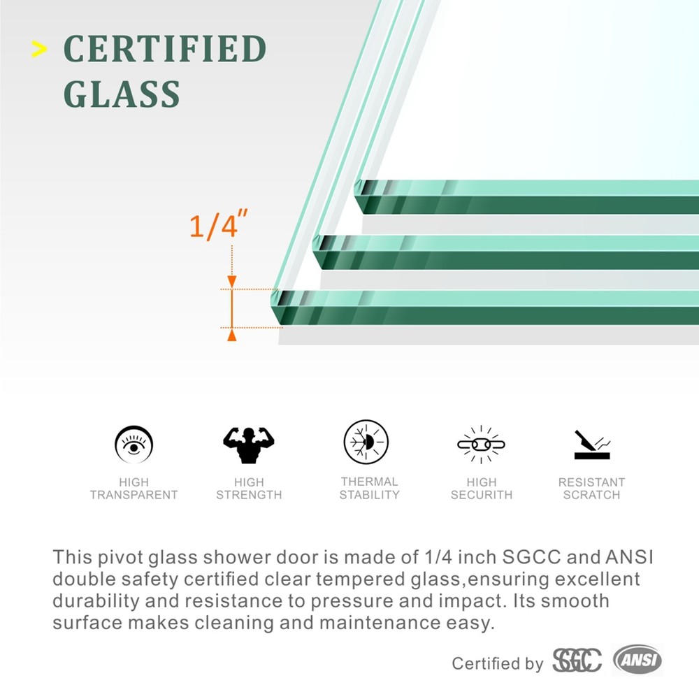 Pivot Shower Room Glass Door This sliding door glass is 30" wide and 72" high, the width can be adjusted from 29.5" to 31"(up to 0.75" on both sides), adopts semi-frameless and versatile design, can be installed on the left or right side. Please Note: All measurements must be taken after walls are finished (tile, back walls, etc.) Easy to Clean The glass surface of this bathroom door glass has an easy-to-clean paint coating, the coating can be waterproof and anti-pollution, reducing the accumulation of water stains and sewage, even if the sliding door screen used for a long time, it keep clean as new. High-quality Materials The shower room glass door is made of 1/4"(6mm) SGCC & ANSI certified tempered glass, the glass is strong and druable,effectively prevent shards from scattering in case of breakage, aluminum frame and stainless steel handle are corrosion-resistant and anti-rust, ensuring durability even in wet environments. Waterproof Design The sliding door glass with bottom/side seal to effectively prevent water from leaking out of the shower when you are taking shower. This thick, durable bathroom door glass prevents water leaks, isolates allwater from the shower room, and keeps the outside clean and tidy at all times. Easy to Install Reversible installation for right or left opening, pivot allows overlapping 180° rotation to save place, step-by-step instructions and hardware included for easy installation, the width of the shower room glass door on the left and right sides can be adjusted. Pivot Glass Shower Door As a professional bathroom product manufacturer, we always provide you with better products and more efficient services, but the following service terms need to be known to you: 1: If you find some problems with the product after receiving the goods, please do not discard the product, because we need you to provide pictures or videos of the relevant faults to better serve you. 2: Please note that we do not bear the installation/assembly costs. If you find a fault during the installation of the product, we will not bear or reimburse this cost because we stipulate that all parts must be checked before booking. 3: Delivery within the United States only, excluding Alaska/Hawaii, Puerto Rico, Guam, Saipan, APO/FPO, US Protectorates and PP Box. Usually the delivery time is 1 to 7 business days. If you still have not received the goods after 7 business days, please contact us immediately and we will track the order for you. 4: If your goods are damaged when delivered, you must refuse the order and describe the damage on the receipt. Just fill in "the goods are damaged". If you accept the goods and the damage is not noted on the receipt, we reserve the right not to refund or replace your goods. If you are not satisfied with your purchase, please contact us within 7 days. Please note that there is a 20% restocking fee and all shipping and handling charges are the responsibility of the buyer.
