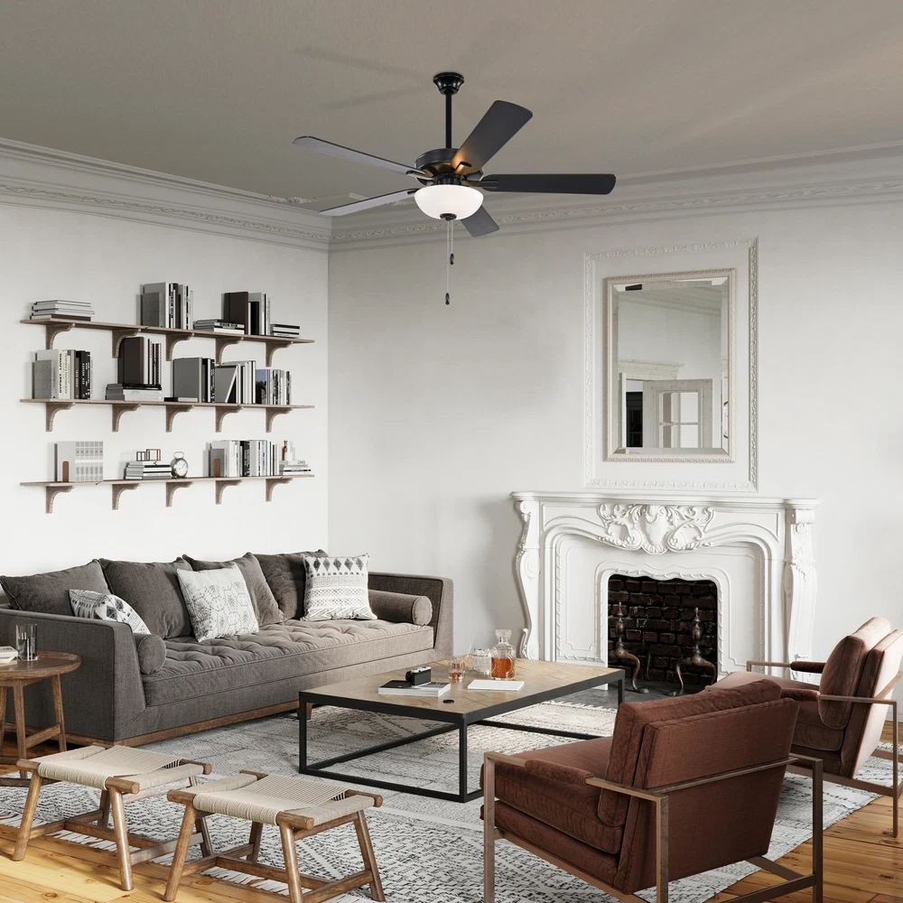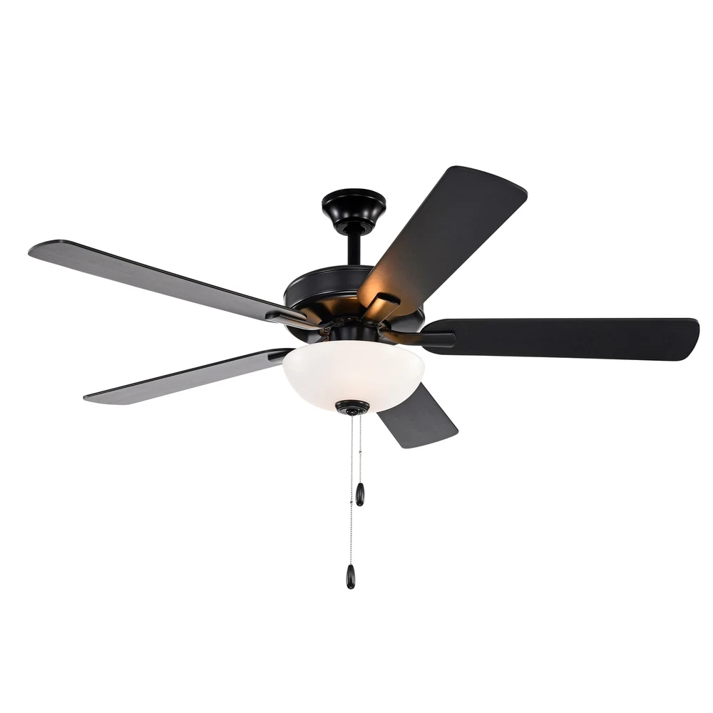 Deliver modern style with this matte black ceiling fan. By using a pull chain, you can choose between three different speeds for customized airflow and maximum comfort. Two 9W medium E26 base bulbs (included) are surrounded by a white diffuser, which will provide plenty of illumination. The reversible black and rustic charcoal wood blades complement modern decor. Place this ceiling fan in any living room or bedroom that is in need of a renovation. Features: Matte black finished Ceiling fan with white plastic shade 5 reversible black / rustic charcoal blades for versatility Takes two (2) max 9-watt medium (E26) base bulbs (Included) 3-speed reversible motor creates strong air circulation Indoor use, large rooms Pull chain included UL listed Energy StarDimensions: Overall: 52 in. Free Shipping Over $49.99* Details Matte Black 52 in. Indoor 5-Blade Reversible Ceiling Fan with Light Kit and Pull Product Description: Deliver modern style with this matte black ceiling fan. By using a pull chain, you can choose between three different speeds for customized airflow and maximum comfort. Two 9W medium E26 base bulbs (included) are surrounded by a white diffuser, which will provide plenty of illumination. The reversible black and rustic charcoal wood blades complement modern decor. Place this ceiling fan in any living room or bedroom that is in need of a renovation. Features: Matte black finished Ceiling fan with white plastic shade 5 reversible black / rustic charcoal blades for versatility Takes two (2) max 9-watt medium (E26) base bulbs (Included) 3-speed reversible motor creates strong air circulation Indoor use, large rooms Pull chain included UL listed Energy Star Dimensions: Overall52 in. Dia. x 16.7 in. H Blade 21.25 in. L x max. 5.5 in. W Downrodone (1) 4.25 in. H Blade Pitch12 degree Canopy5.1 in. L x 2.3 in. H Fan Efficiency: Airflow3289 Cubic Feet Per Minute Airflow Efficiency110 Cubic Feet Per Minute Per Watts Energy use32 Watts