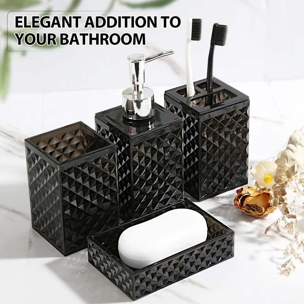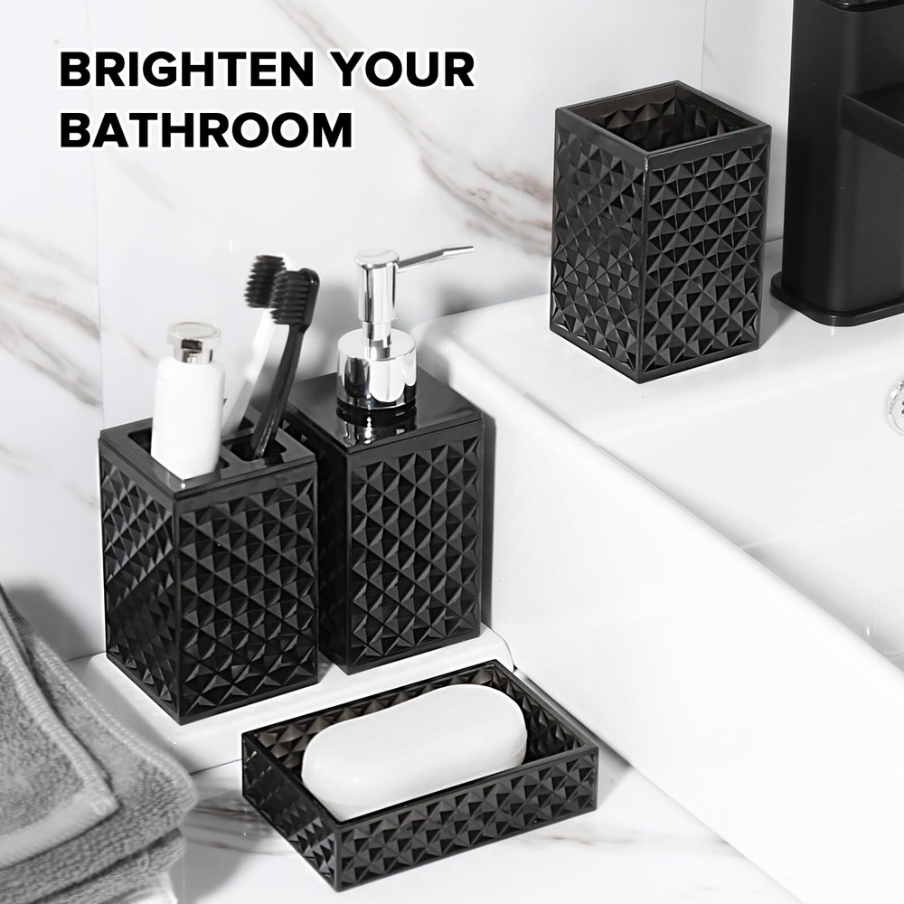 RYTOXILO Black Bathroom Accessories Set, 4 Pack Matte Black Bath Accessory Sets Complete, Acrylic Soap Dispenser and Toothbrush Holder Set for Bathroom Counter Sink, Modern Bathroom Decor 【ATTRACTIVE 4 PACK BLACK BATHROOM ACCESSORIES】 Get these DIAMOND STYLE elegant additions to your bathroom right now! Let these black bathroom accessories sets brighten your bathroom nicely! This black bathroom accessory set is perfect for every bathroom theme no matter boho, modern, farmhouse, vintage, and western, you name it! You would get a SOAP DISPENSER, a TOOTHBRUSH HOLDER, a MULTIFUNCTIONAL TUMBLER, and a SOAP DISH in just ONE set! 【GORGEOUS DIAMOND PATTERN DESIGN】Diamond is a symbol of purity and magnificence. Such a diamond-style acrylic black bathroom set could be easily suitable for your bathroom themes. Brighten up your bathroom space in a way that’s as unique as you are. Each black bathroom accessories set is handcrafted by experts, and each diamond pattern on it is equally sparkling, not only in your bathroom but also in the eyes of every guest who enjoys it. 【HIGH QUALITY ACRYLIC MATERIAL】All these black bathroom accessories sets complete are made of high-quality BPA-free acrylic. Elegant, sturdy, and never get rusted. Not easy to be broken or tip over. Let this black bathroom soap dispenser and toothbrush holder set complement your bathroom vanity decor. 【PRACTICAL FOR USE】If you are a person who loves enjoying your life, you would find that this black bathroom set meets all your daily needs in your life. The 10oz black soap dispenser filled with hand soap/lotion/face wash could be used for a long time; The black toothbrush holder could hold multiple toothbrushes and toothpaste; The multifunctional tumbler could hold combs and shavers; And the soap dish helps you place your soap very well. Makes your bathroom look tidy and wonderful 【WONDERFUL GIFT IDEA & SUPERIOR QUALITY SERVICE】This black toothbrush holder set is great and unique for housewarming, wedding, birthday, Mother's Day, Thanksgiving Day for mom, sister, colleague, and friends. We provide 100% product quality guarantee, the fastest, and the best service to ensure your satisfaction. Please feel free to let us know if you have any questions. SHIPPING Domestic Buyers - We have confidence in our products, but if you are not fully satisfied please contact us within 30 days of purchase and you will get full refund. - We ship within 3 business days of payment, usually sooner - We offer FREE shipping on all orders! - We only ship to the lower 48 states, no APO/FPO addresses or PO Boxes allowed International buyers – please note: Import duties, taxes, and charges aren't included in the item price or postage cost. These charges are the buyer's responsibility. - Please check with your country's customs office to determine what these additional costs will be prior to bidding or buying. * Order Cancellation Policy ** You can return a product for up to 30 days from the date you purchased it. 1. The seller reserves the right to cancel the special case only due to eBay cancellation fee. 2. The decision of seller is the final. 3. The seller will respond to the cancellation request within 2 business days. Please wait for the result of cancellation. 4. In case the cancellation is not completed by some reasons, the buyer can follow the options below to get the refund. 4.1 The buyer can reject the item when it arrives. 4.2 The buyer can send the item back to the seller within 30 days If the buyer receives item (USA Shipment ONLY). The seller will provide the FREE return label to the buyer when the buyer opens " Return Item" case on eBay by using the reason as "Change my mind" ONLY. 5. When buyer has placed the order. The order will be processed and completed by automatic warehouse system within 5 minutes. In case that buyer sends the cancellation request after 5 minutes of placing the order, the request will be rejected. **Sending direct message to cancel the order is not allowed for every case.* Return Policy For the return case - If buyer would like to return the items for refund or replacement, please CONTACT SELLER to receive the free return label from seller. The refund or replacement will be processed with the tracking number of return label which is provided by seller only. The other ways of return which are not approved by seller will not be processed for the refund or replacement.