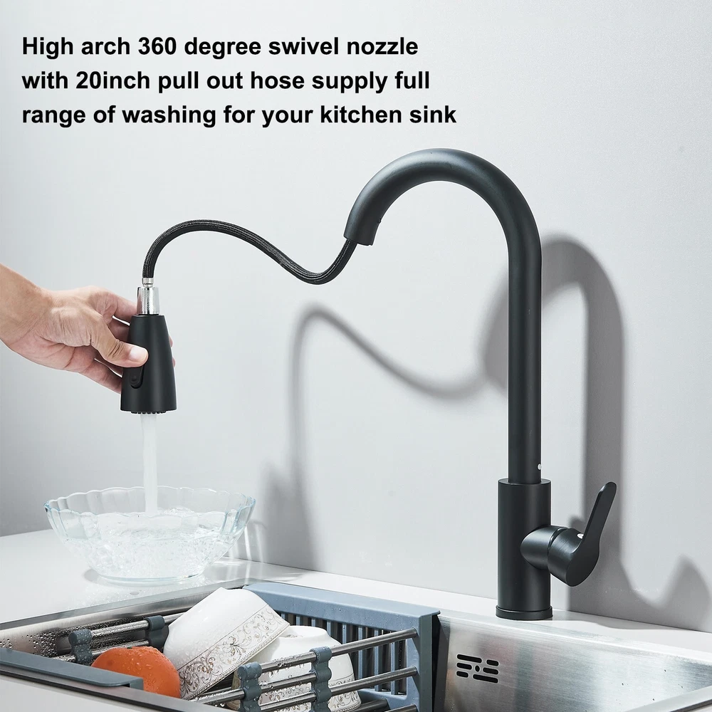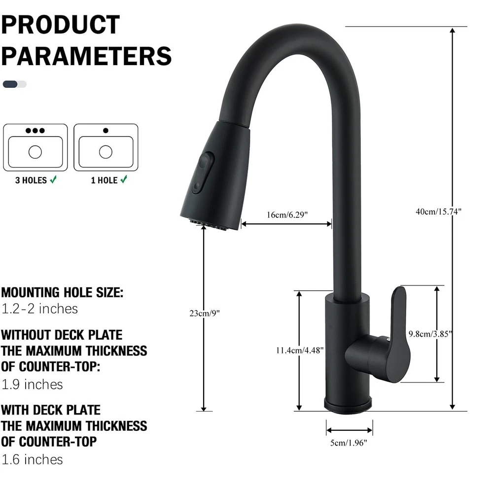 Type: Kitchen Faucet Item Height: 15.74 in Custom Bundle: No Number of Faucet Handles: 1 Features: Pull-Out, Quick Cleaning, Swirl, Water Conservation Items Included: Hose, Mixing Valve, 10" Cover Plate Faucet Mounting Type: Mixer Shape: High Arc Model: Kitchen Tap Installation: Single Hole Suitable For: Kitchen Sink Room: Kitchen Number of Faucet Holes: 1 Color: Black Finish: Brushed Nickel Material: Plastic Country/Region of Manufacture: China Thread size: 3/8" Manufacturer Warranty: 5 Years MPN: x Style: Modern Handle Type: Lever Labels & Certifications: Low Lead Compliant Assembly Required: Yes Spout Height: 9 in Brand: Rozin