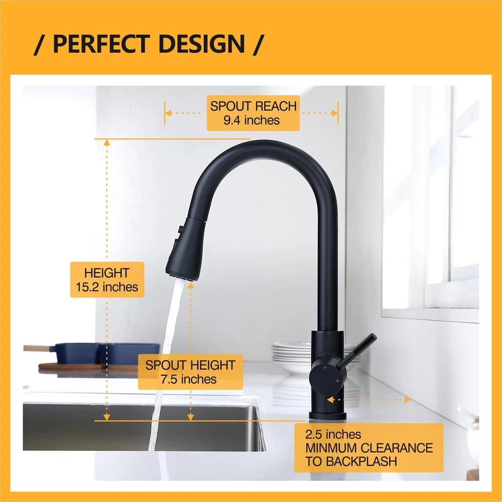 Black Kitchen Faucet with Pull Down Sprayer, Rv Kitchen Sink Faucets, Fingerprint Resistant Single Hole Single Handle Stainless Steel, Matte Black Flexible Cleaning: The kitchen faucet can be pulled out flexibly for cleaning with 360 degree rotation. The cleaning range of ordinary faucet is not large enough, but the kitchen faucets with pull down sprayer can let you clean easily, free to pull, meeting all the big cleaning experience. Standard Size: Total Height: 15.2”, Spout Height:7.5”, Spout Reach: 9.4”. The kitchen sink faucet will come with all the mounting hardware, 3/8” hot and cold water hoses included, and you can install it by yourself without a plumber to save money and time. What we do offer is a good product at a rock-bottom price. 3 Setting Modes: Faucet for kitchen sink with three setting modes can meet all your requirements of kitchen housework. This kitchen faucets for sink can allow you to easily move from aerated stream to powerful spray. You can change different modes as the sprayer head is with rocker switch. Considerate Design: Base on a large number of investigations for famlies, we found that children also use faucets frequently. In order to prevent children from getting scalded, we specially designed cold water in the front when pulling forward the handle on the sink faucets for safety. Heathier Drinks: All the water pipes inside the brushed nickel faucet are food grade materials, SUS304 stainless steel material corrosion prevention and rust prevention, you don't need to worry about the safety of drinking water, with comfortable, drink at ease. MAKE LIFE EASIER has always been committed to simplifying the busy lifestyle and providing consumers with quality sink faucet with sprayer. We strive to motivate people to improve the quality of life with simple and practical design. We encourage you to experience 's difference and make life easier. PREMIUM CERAMIC CARTRIDGE 500,000 open&close tests done on pull down kitchen faucet handle to provide professional drip-free durability performance. We adopt attractive, reliable, and innovative product designs to provide your whole family with better use and protection. HIGHT QUALITY The Solid 304 stainless steel material for water faucet, provides enhanced leak-tightness and non-corrosion. It’s a kind of health materials which does not release harmful substances to ensure family health and hygiene. Also, stainless steel with matte black finish helps your faucets for kitchen sinks perform like new for life. Food-grade PEX material PEX inner hose for rv sink faucet suits for potable water supply applications without odds or bad taste takes special care for your family health. Shipping We offer FREE shipping on all orders! We ship within Three business days of payment, usually sooner. We use a selection of shipping services such as UPS, FedEx, USPS etc. We only ship to the lower 48 states, no APO/FPO addresses or PO Boxes allowed. Local pickups and combined shipping options are not provided at this time. Return You can return a product for up to 30 days from the date you purchased it. Any product you return must be in the same condition you received it and in the original packaging. Please keep the receipt. Payment We accept payment by any of the following methods: PayPal Please pay as soon as possible after winning an auction, as that will allow us to post your item to you sooner! Feedback Customer satisfaction is very important to us. If you have any problem with your order, please contact us and we will do our best to make you satisfied. Contact Us If you have any queries, please contact us via ebay. We usually respond within 24 hours on weekdays. Please visit our eBay store to check out other items for sale! Thank you for shopping at our store.