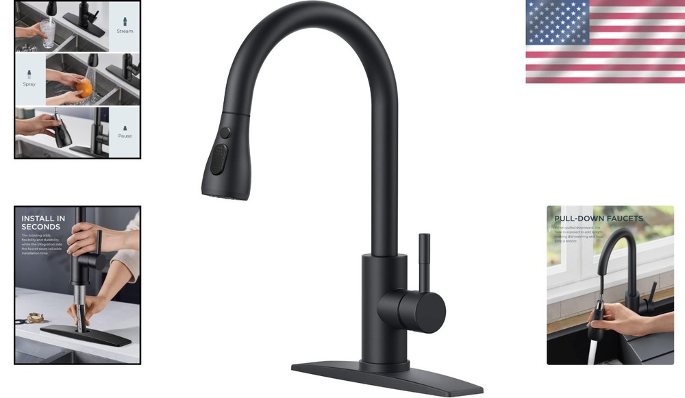 Matte Black Stainless Steel Faucet with Pull Down Sprayer ‹ › ‹ › ‹ › ‹ › ‹ › ‹ › ‹ › ‹ › ‹ › Matte Black Stainless Steel Faucet with Pull Down Sprayer Superior Performance: Certified to cUPC, NSF 61/372, and Lead-Free standards for your peace of mind. Constructed with SUS 304 stainless steel, ensuring durability and longevity. Features drip-free ceramic cartridges and high-temp PEX hoses for enhanced safety. Product Specifications: Overall Height: 14.76 inches Spout Height: 6.69 inches Maximum Deck Thickness: 1.5 inches Pre-drilled Hole Size Requirement: 1.30"-1.38" Flow Rate: 1.8 Gallons Per Minute, saving 20% water. Versatile Functionality: Three spray settings: Stream, Spray, Pause for all your kitchen needs. High arc with an 18 inch retractable hose ensures efficient sink coverage. 360° rotation spray head and a single handle for effortless control. Minutes to Install: Installation in under 15 minutes with no professional help required. Includes a 10-inch detachable deck plate for one, two, or three-hole sinks. All mounting hardware included for a hassle-free setup. Efficient and Simple Cleaning: Five-layer nanotechnology finish that resists fingerprints and spots. Easy to clean with a damp cloth, maintaining a tidy look effortlessly. Where Style Meets Reliability: This sleek faucet embodies precision craftsmanship and minimalist design, seamlessly complementing most kitchen sinks. Its modern elegance ensures effortless functionality, making it a long-lasting addition to your culinary space. Transform your kitchen experience with this faucet that harmoniously blends style and practicality. Upgrade your home today! Shipping Free & Fast Shipping - We offer free shipping to most of the USA with a normal delivery time of 3-10 business days. However, due to various situations, additional delivery time (up to 3 weeks) may be required for some items. Alternative Carriers - We may use alternative carriers (e.g. USPS, FedEx, UPS, etc.) to ensure your package arrives safely and on time. Due to the use of multiple carriers, we are unable to provide a tracking number automatically. Handling Time - Orders are processed and shipped within 1-5 business days of receiving cleared payment. Shipping Restrictions - Shipping to Alaska, Hawaii, Puerto Rico, Guam, and other US territories may incur shipping charges or delivery restrictions. Please contact us before ordering, or your order can be refunded/cancelled. State Restrictions - There may be restrictions based on your state of purchase. For example, certain items may not be shipped to California due to state regulations. Contact for Tracking Updates - If you require tracking updates or have any concerns about the delivery of your order, please feel free to contact us, and we will be happy to assist you. Return 30-Day Hassle-Free Returns - We want you to be completely satisfied with your purchase. If you are not, you can return the item within 30 days of receiving it for a full refund or exchange. Easy Return Process - To start a return, simply contact us and we will provide you with a prepaid return shipping label and detailed instructions. Restocking Fee - There are no restocking fees for returns. However, the buyer is responsible for return shipping costs if the return is not due to a seller's error. Refund Processing Time - Refunds will be processed within 5 business days of receiving the returned item in its condition. Payment We accept all major credit cards, PayPal, and Apple Pay for your convenience. Your payment information is secure and encrypted to ensure a safe and seamless transaction. Please complete your payment within 3 days of purchase to avoid any delays in shipping. Feedback Your feedback is extremely important to us. We strive to provide the best products and customer service possible. If you are satisfied with your purchase, please take a moment to leave us a positive review. If you have any concerns or issues with your order, please contact us before leaving negative feedback. We are committed to resolving any problems and ensuring your satisfaction. Contact Us If you have any questions or concerns, please feel free to out to our customer support team. You can contact us through the eBay messaging system. We are available Monday to Friday, 9:00 am to 5:00 pm EST, and we will do our best to respond to your inquiry within 24 hours. Buy it now and enjoy a pleasant shopping experience! Item Weight: 3.69 pounds Unit Quantity: 1 Material: Stainless Steel,SUS 304 stainless steel,ceramic,PEX hoses Suitable For: Kitchen Sink,Farmhouse,Camper,Laundry,RV,Bar,Outdoor,Sink Features: Pull-Out,360° rotation,high arc,18 inch retractable hose,single handle Room: Kitchen Items Included: Instruction Manual,Deck Plate,Handle,Sprayer Type: Kitchen Faucet Finish: Black Number of Faucet Holes: 1 Color: Matte Black Number of Faucet Handles: 1 Faucet Mounting Type: Deck Mounted Shape: High Arc Handle Type: Lever Installation: Single Hole Faucet Hole Spacing: 1.30-1.38 inches Spout Height: 6.69 Inches Style: Classic