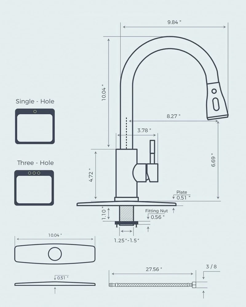 Hose Length: 26.5 Inches Shape: High Arc Installation: Single Hole Faucet Hole Spacing: 1.30-1.38 inches Color: Matte Black Number of Faucet Handles: 1 Suitable For: Kitchen Sink, Farmhouse, Camper, Laundry, RV, Bar, Outdoor, Sink Hole Count: 1 Faucet Mounting Type: Deck Mounted Brand: Unbranded Recommended Uses For Product: Bar, Kitchen, Outdoor, Rv, Sink UPC: Does Not Apply Installation Type: Single Hole Item Weight: 3.69 pounds Mounting Type: Deck Mount Handle Material: Stainless Steel Handle Type: Lever Items Included: Deck Plate, Handle, Instruction Manual, Sprayer Type: Kitchen Faucet Batteries Required?: No Features: Pull-Out, 360° rotation, high arc, 18 inch retractable hose, single handle Room: Kitchen Finish Type: Black Room Type: Kitchen Number Of Pieces: 4 Finish: Black Number of Faucet Holes: 1 Style: Classic Batteries Included?: No Included Components: Deck Plate, Handle, Instruction Manual, Sprayer Spout Height: 6.69 Inches Assembly Required: No Material: Stainless Steel, SUS 304 stainless steel, ceramic, PEX hoses gtin13: Does Not Apply Maximum Flow Rate: 1.8 Gallons Per Minute Product Dimensions: 9.84"d X 10.04"w X 14.76"h Handle Location: Left Or Right Number Of Handles: 1 Spout Design: High Arch Gooseneck